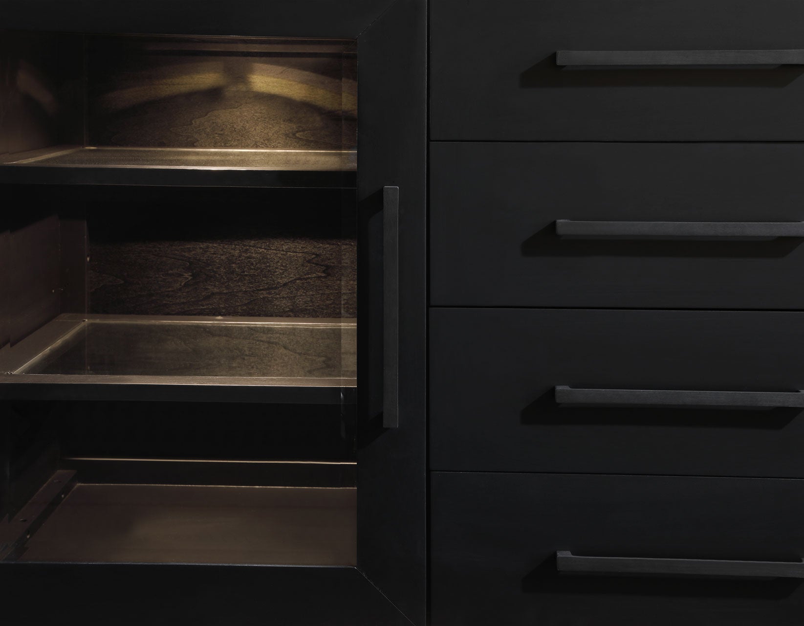 A modern farmhouse interpretation of the classic dining side piece, the Magnolia Server brings both beauty and function to any room. The glass doors and shelves offer a striking display area that is illuminated with interior LED lighting operated with a touch of the door hinges. Adjustable shelves and four drawers offer generous storage area that can be configured to fit display pieces exactly. Interior glass shelves allow light to reach every corner of the cabinet for striking display piece.