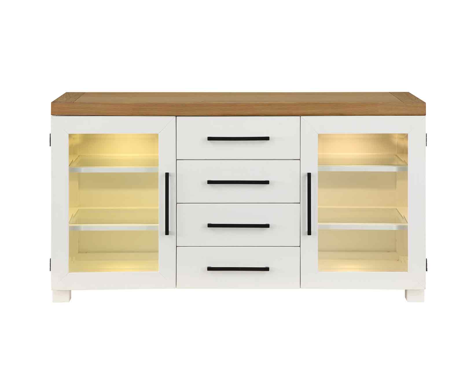 A modern farmhouse interpretation of the classic dining side piece, the Magnolia Server brings both beauty and function to any room. The glass doors and shelves offer a striking display area that is illuminated with interior LED lighting operated with a touch of the door hinges. Adjustable shelves and four drawers offer generous storage area that can be configured to fit display pieces exactly. Interior glass shelves allow light to reach every corner of the cabinet for striking display piece.