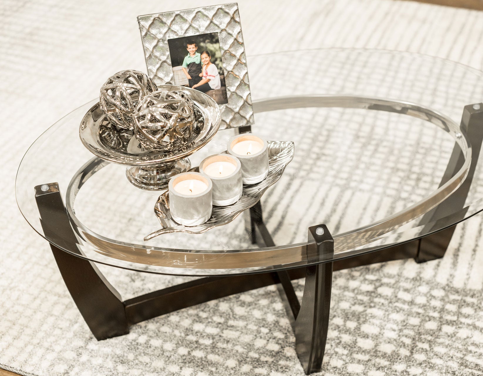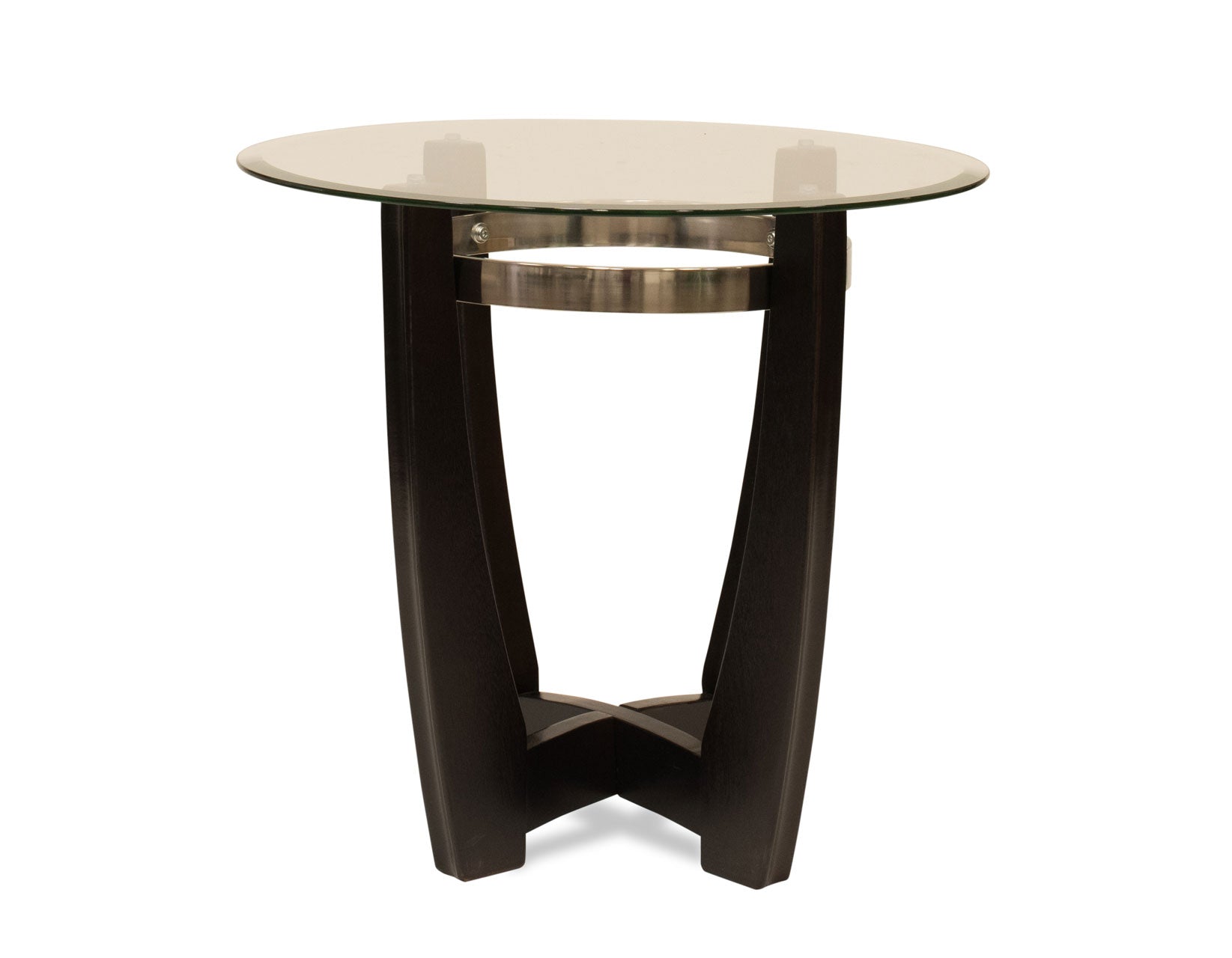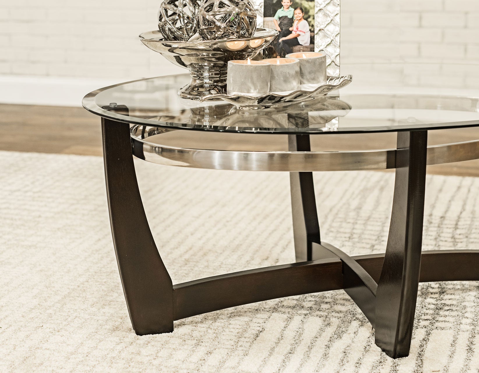 A symphony of materials creates a stunning set of occasional tables in this Matinee 3-Pack Set. Ebony finished wood base combines with a sparkling chrome ring and a tempered glass top to create a table set that looks great in any contemporary setting. This 3-Pack set includes all the tables you will need to appoint your living room with Cocktail Table and 2 End Tables.