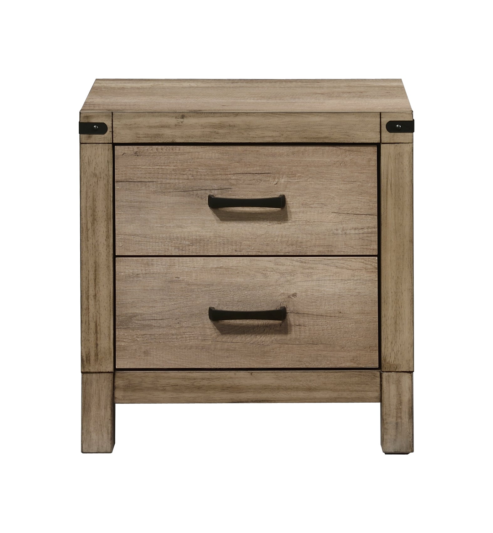 - Contemporary rustic styling with upholstered headboard and woodgrain finishing