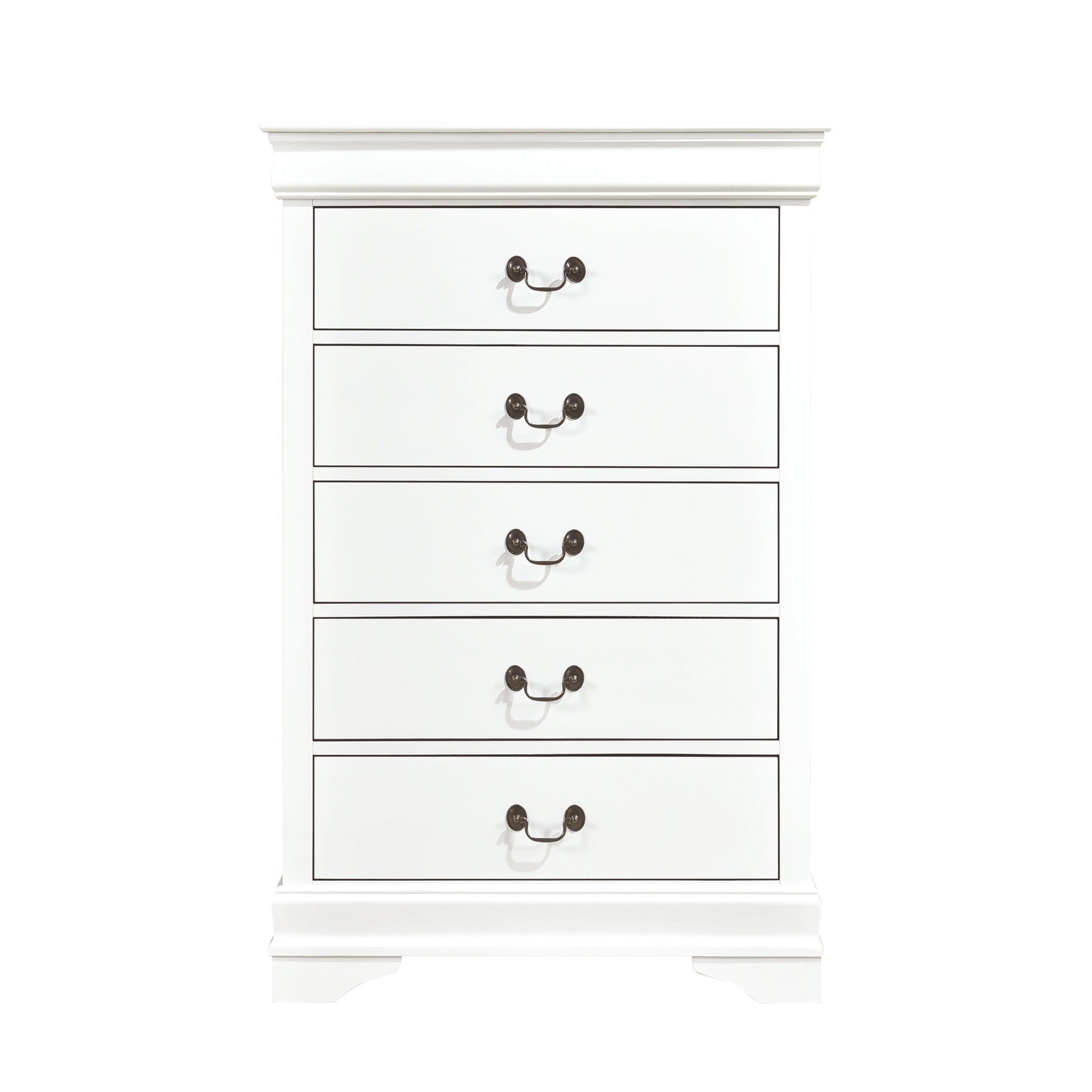 Traditional in design and modest in scale, the elegant Mayville Collection takes its design inspiration from the classic Louis Philippe styling. The Okume veneer of the chest is paired with a white finish and is accentuated by antique brass tone drop handles.