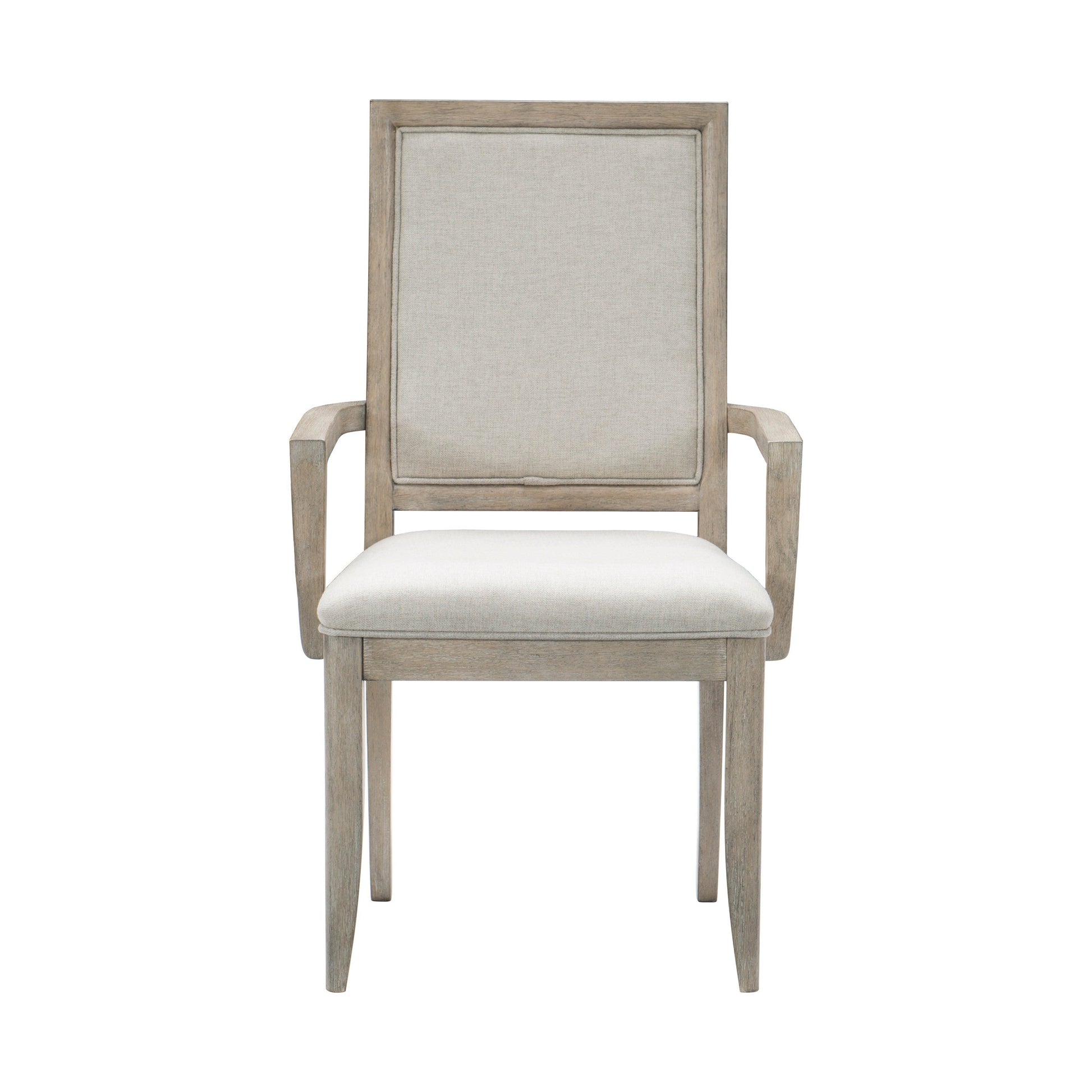 The sophisticated modern styling of the McKewen Collection brings refined design to the elegant space of your dining room. The neutral tone of the arm chair’s fabric perfectly complementes the dining table with the oak veneer and gray finish.