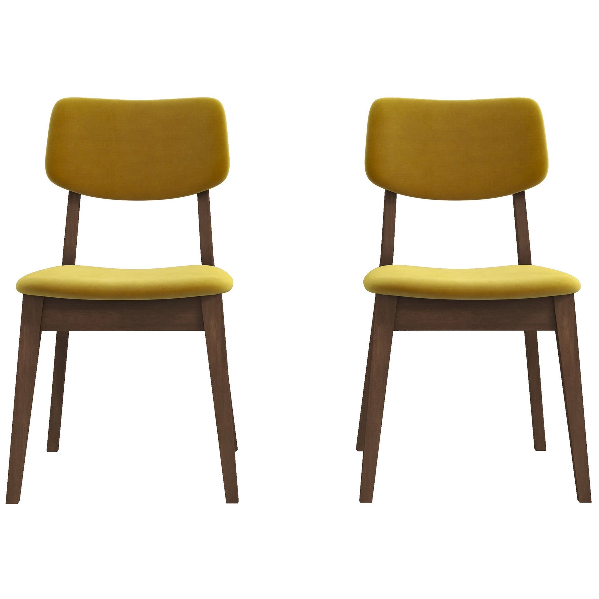 Introducing a touch of mid-century modern elegance to your dining space is effortless with this exquisite pair of dining chairs. These chairs boast a sleek armless design, ensuring effortless tucking beneath your dining table or breakfast nook. Crafted with the most attention to quality, they are constructed from solid wood, their foundations supported by splayed and tapered legs that embody the classic mid-century aesthetic. The chairs' split backs exude a captivating retro-inspired charm that sets them apart. Offering both style and comfort, these chairs feature contoured seats and back panels, expertly upholstered in sumptuous velvet that covers a plush foam filling