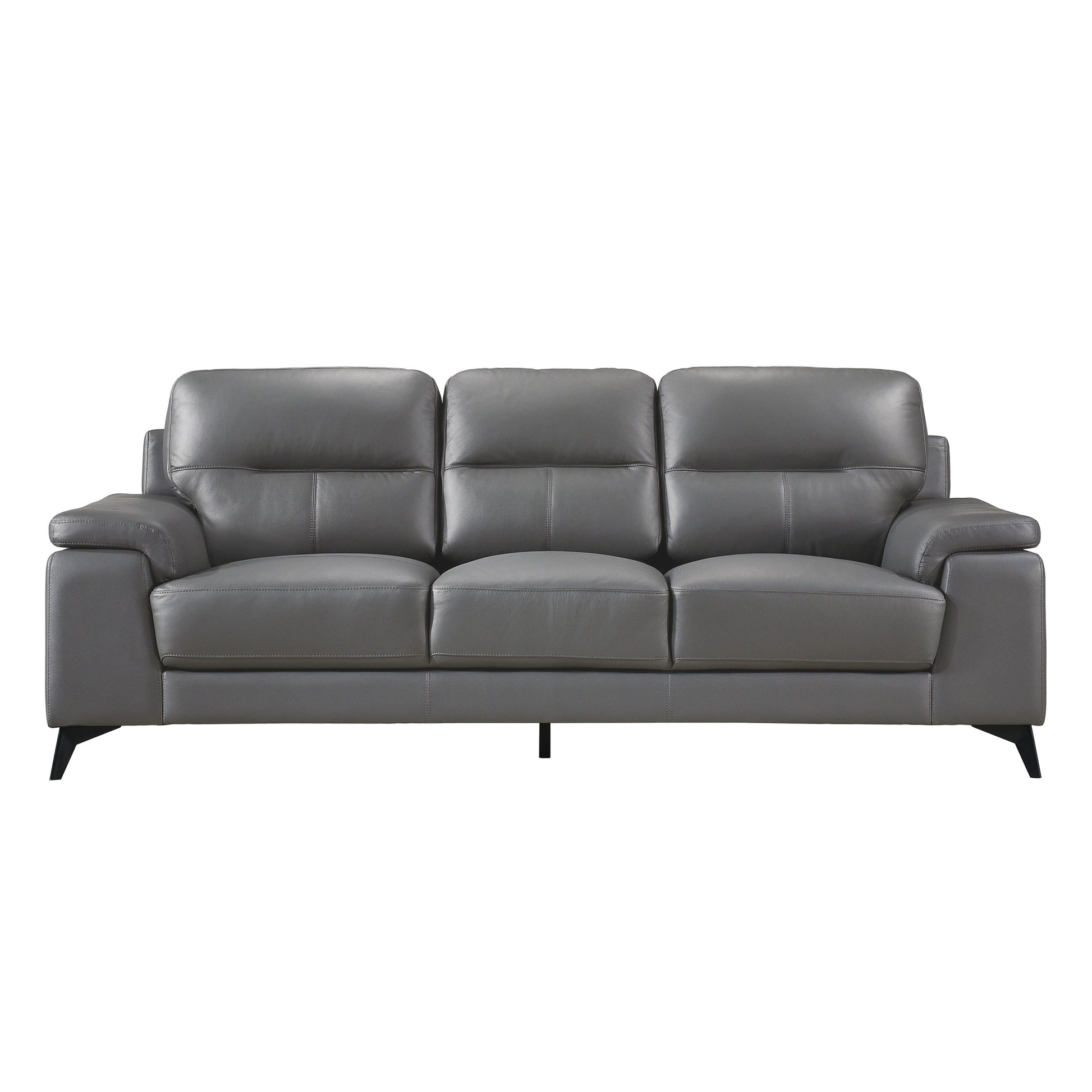 Styled for the modern home, the Mischa Collection’s sofa blends the luxurious feel of leather with the comfort of plush seating. The dark gray top grain leather cover, with faux leather, enhances the sleek profile of the collection. Contoured pillow-top arms and black metal legs further enhance the modern stance. Coordinating love seat and chair are available as well as an optional silver top grain leather cover with faux leather match.