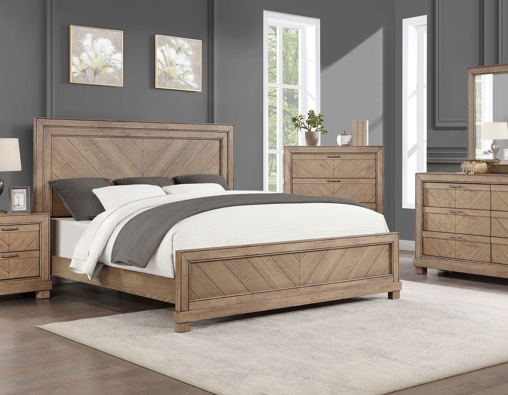 A wonderful bedside companion in weathered sand with satin nickel hardware, the Montana Nightstand stores all essentials within easy reach of the bed. Two drawers feature have safety stops and are fully extendible to maximum storage space within the Nightstand. Chevron fronts add a simple design that adds detail to the weathered sand exterior.