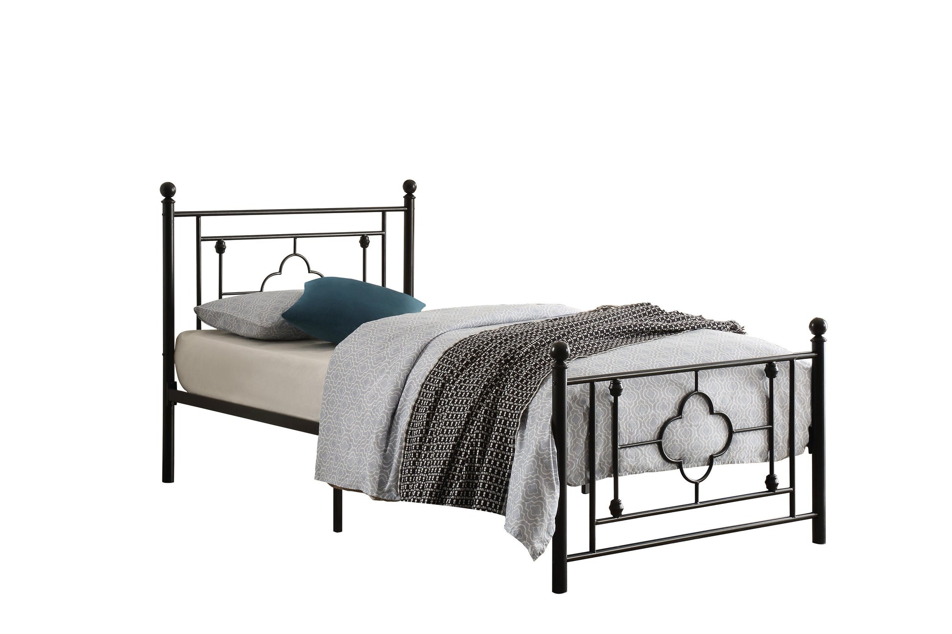 Ball finials, prominent decorative jointing and classic quatrefoil pattern lend to the modern traditional look of the twin size Morris Collection. The collection is also offered in full for versatile placement within your home.