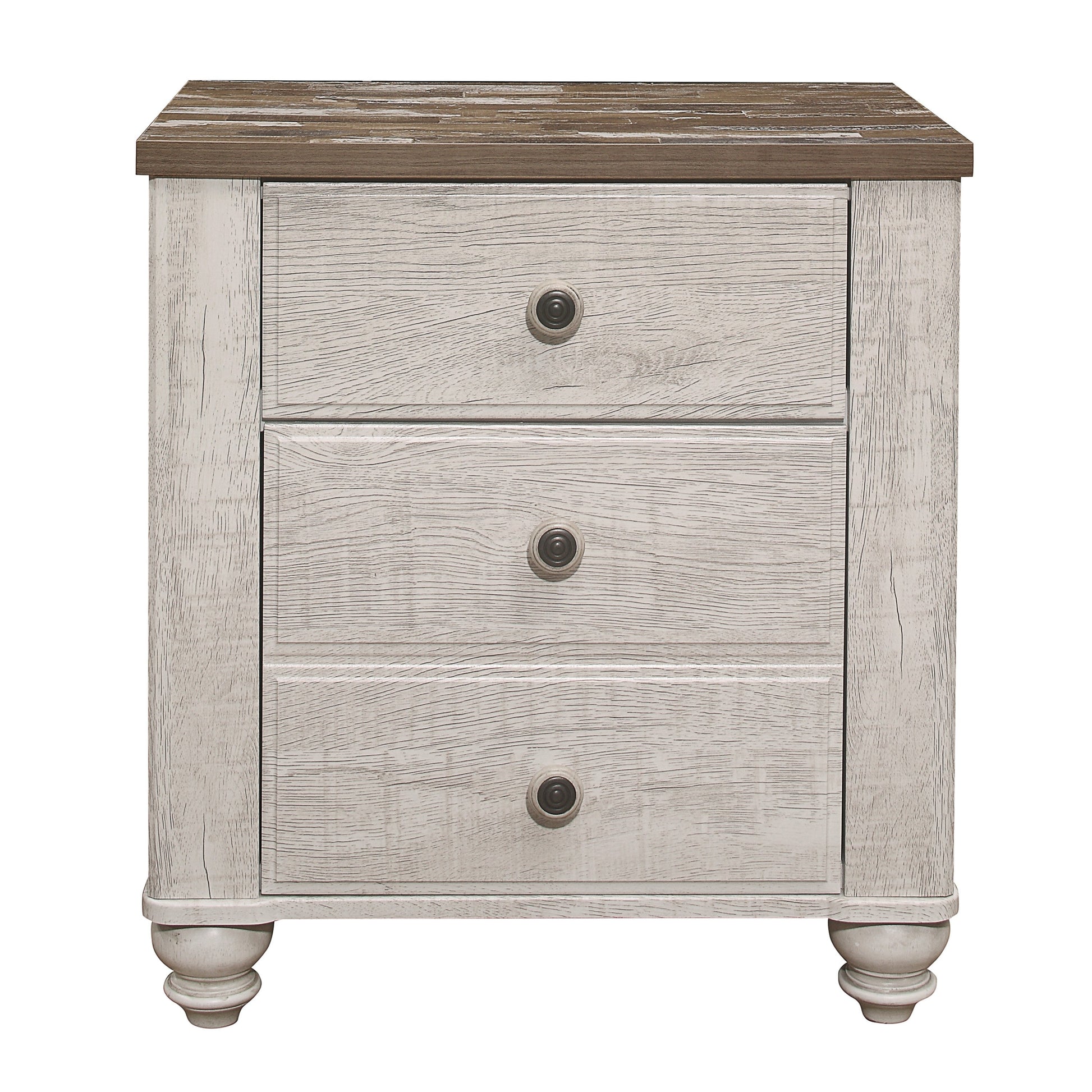 Transitional-rustic styling is expertly achieved in the design of the Nashville Collection. The two-tone faux wood look of melamine provides distinct contrast with antique white and brown lending visual texture to the nightstand. The classic framing of the collection is paired with knob hardware that features white wood and black metal, to complete the rustic look.