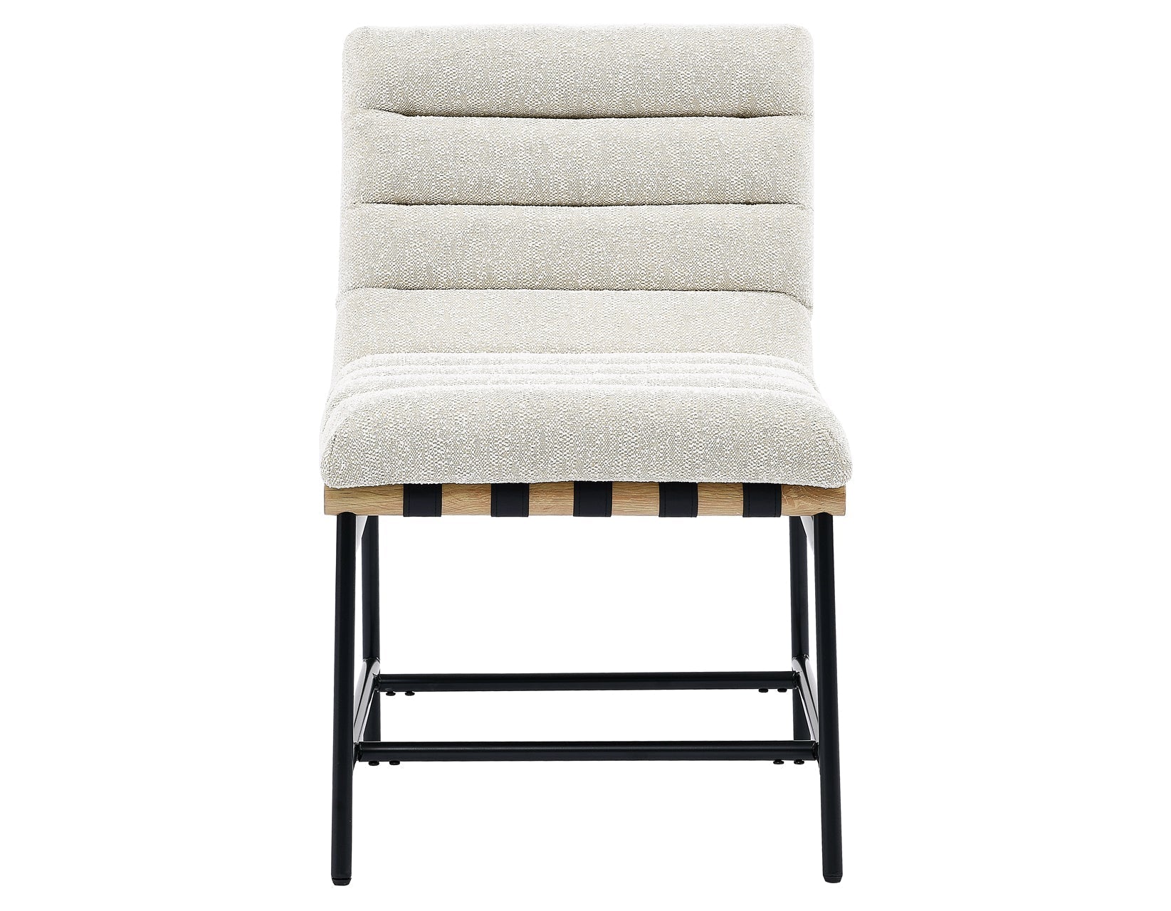 The Nicco Eggshell Polyester Side Chair elevates any space with its perfect blend of modern design and comfort. Ideal for dining, accent, or office use, this chair features a cushioned seat and back with a sleek channel design, upholstered in easy-care, textured polyester fabric in an eggshell color that complements any décor. The webbed seat suspension offers “floating” comfort, while the durable black iron frame, reinforced with side and cross stretchers, ensures lasting stability. The Nicco Side Chair delivers style and function in one sleek package.
