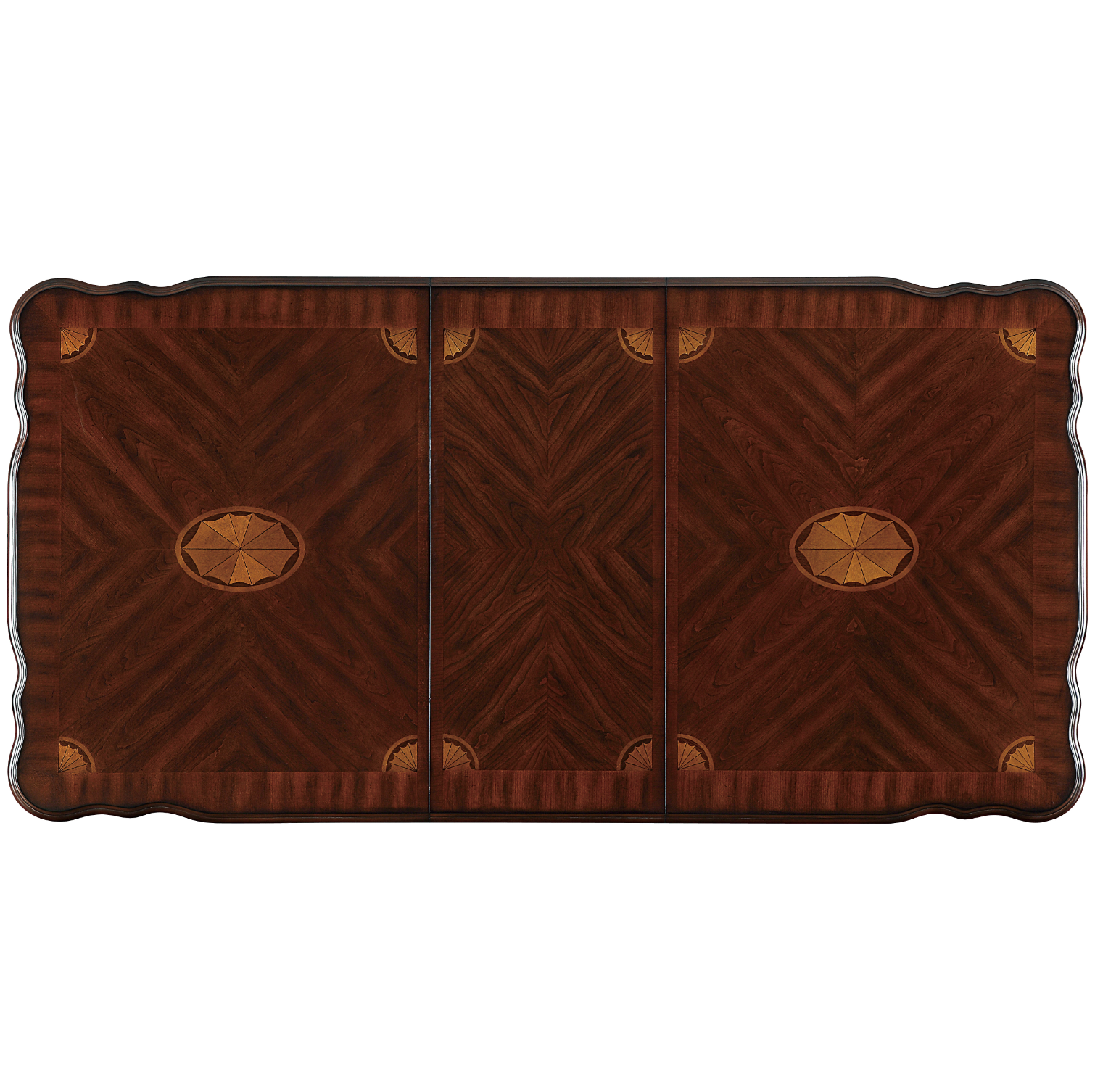 Traditional design elements are elegantly layered to create the beautiful Norwich Collection. Shell motif, egg & dart molding, rope molding, ball and claw feet, with elegantly designed inlay begin the design journey. Book-match cherry veneer prominently highlights the top of the rectangular table and features oval inlay decorative accenting. The table is offered in a dark cherry finish.