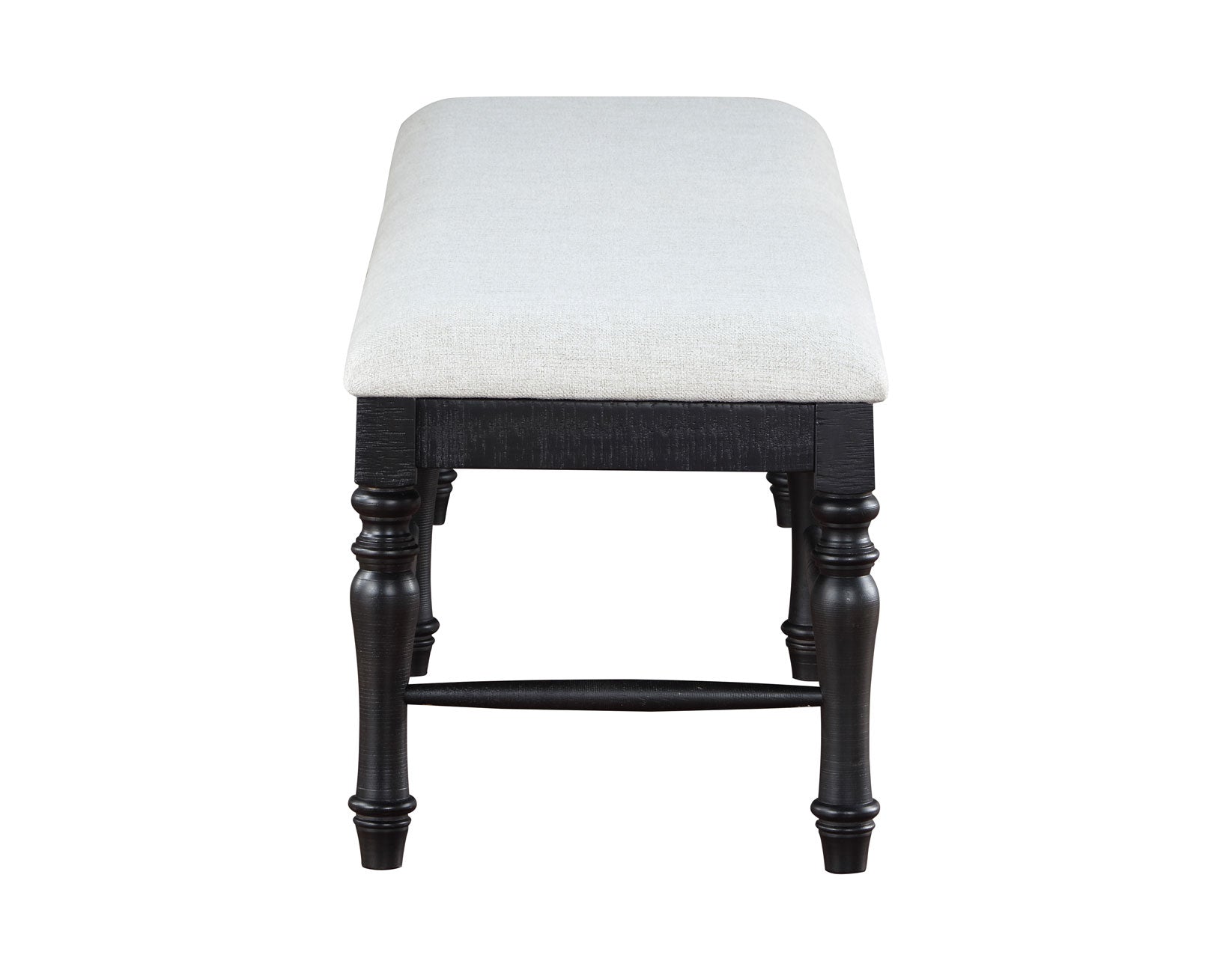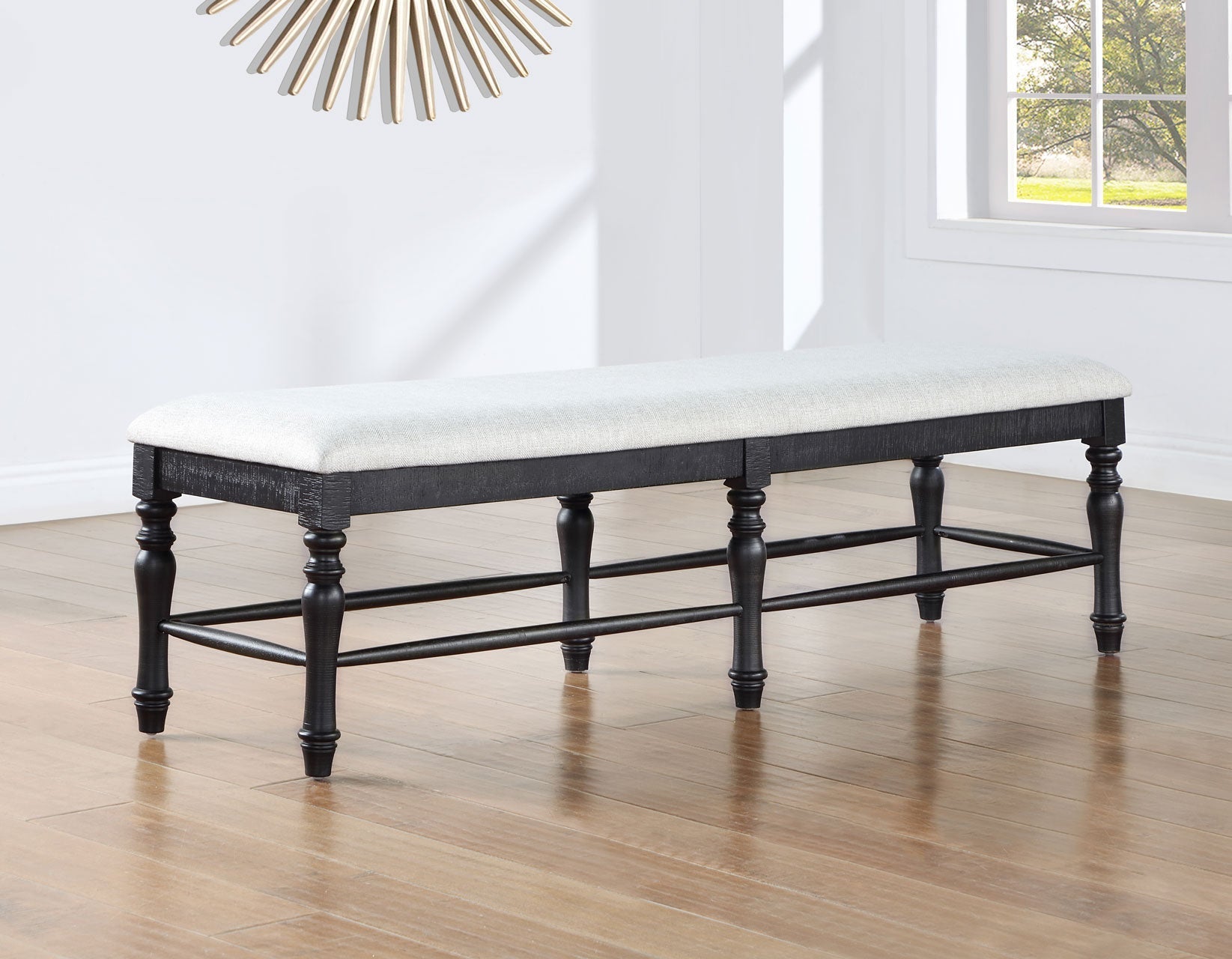Featuring a sleek black finish over solid Asian hardwoods, the Odessa Bench is a modern interpretation of a classic farmhouse style. The 65.5-inch bench is made from solid Asian hardwoods and can accommodate three adults comfortably., ts solid wood turned legs, generously supported with stretchers to ensure stability and longevity. The fully cushioned seat, adorned with easy-care white polyester fabric, offers both comfort and a striking black-and-white contrast, adding a contemporary touch to your decor. Accent your home with the timeless elegance of the Odessa Bench, where tradition meets the present.