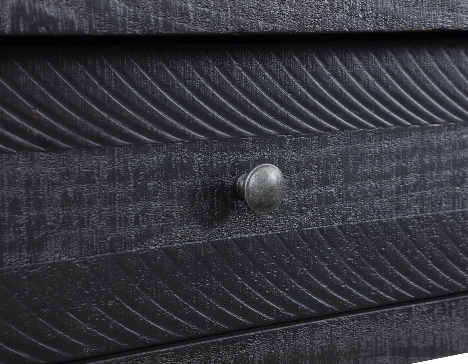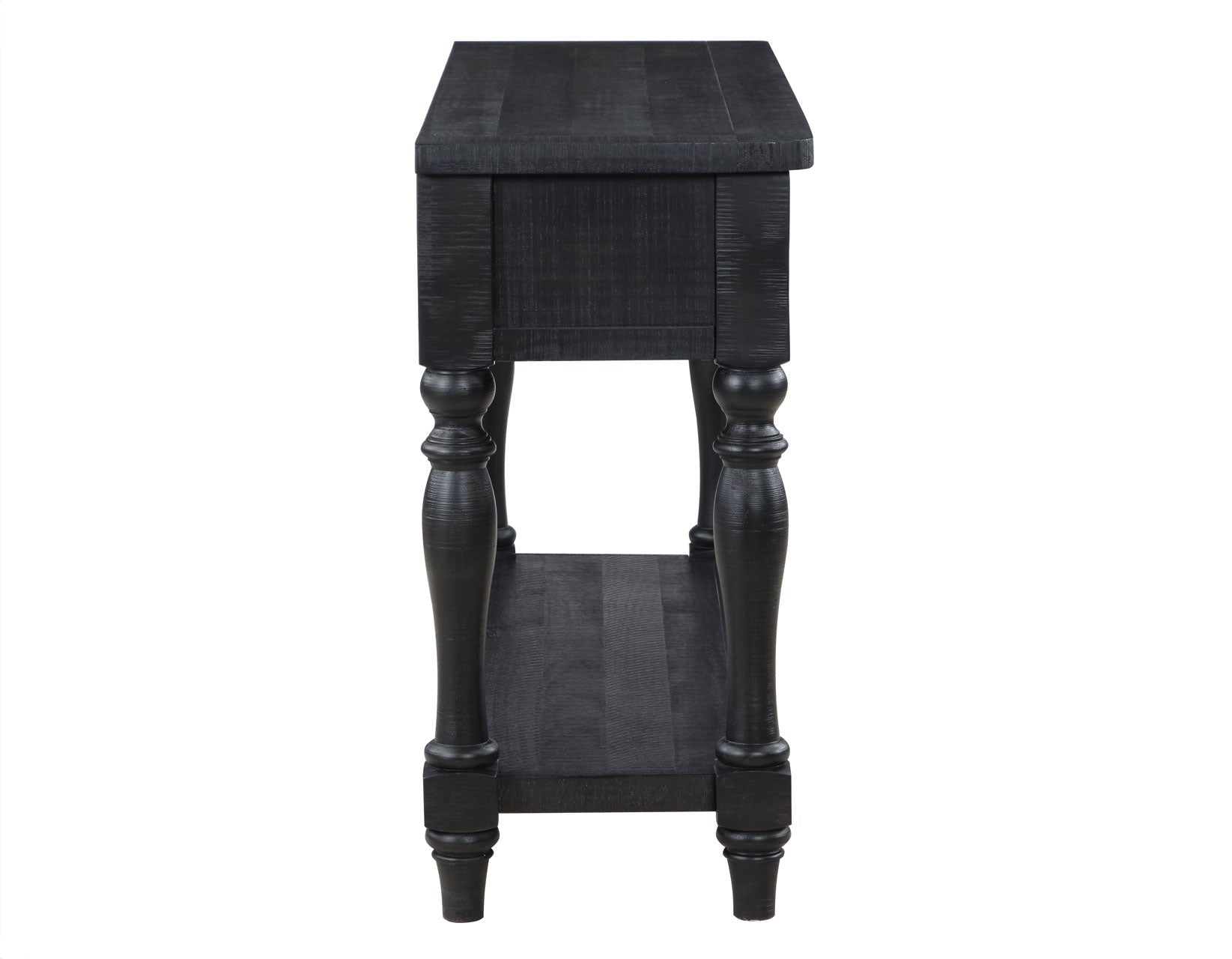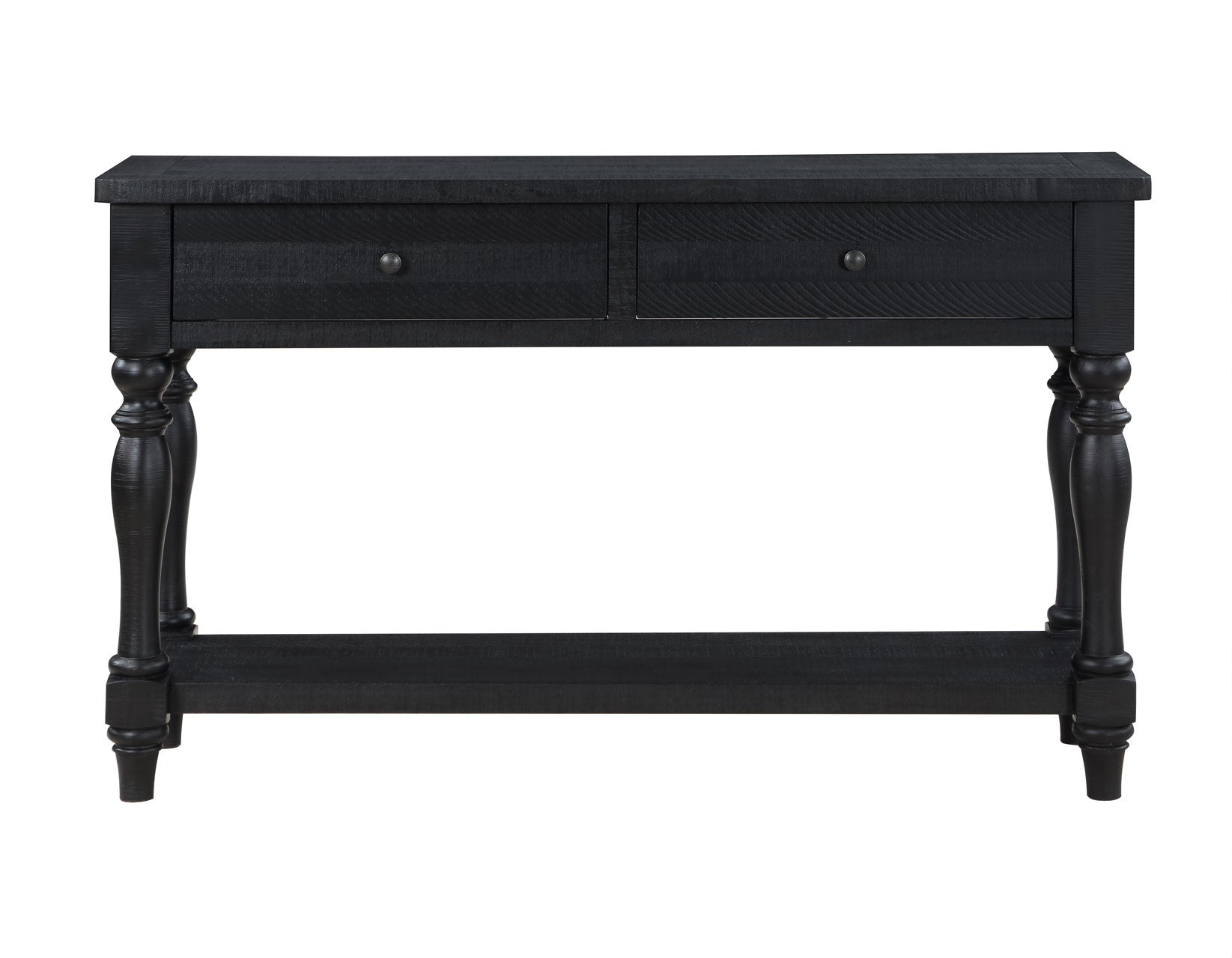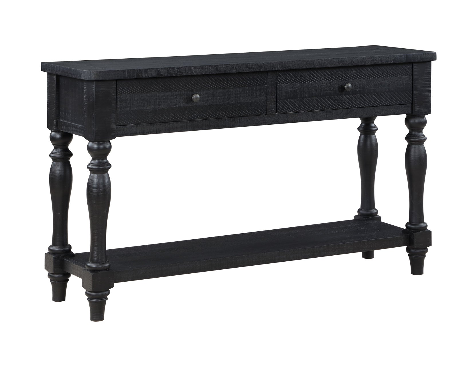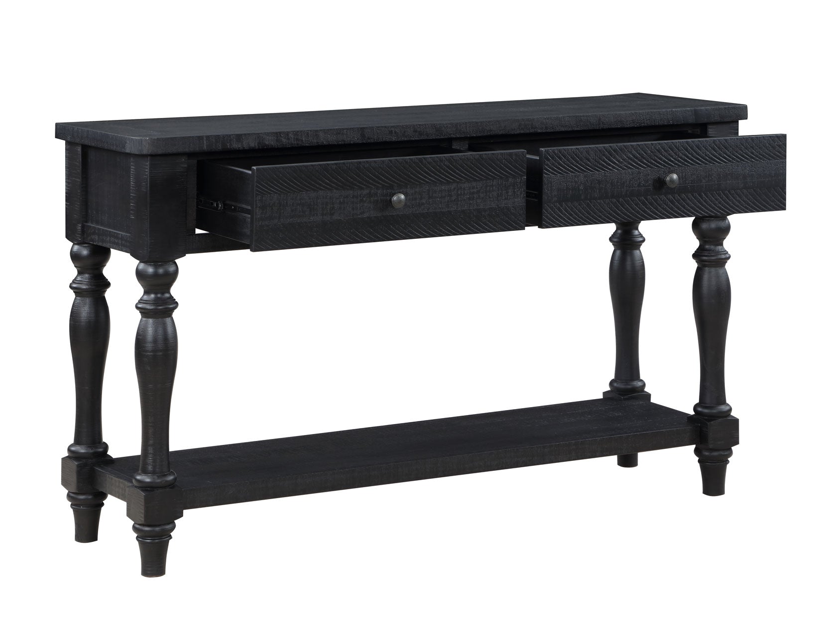 The Odessa server embodies farmhouse-inspired charm, offering a relaxed yet refined piece that serves as the perfect dining or accent piece for any room. Crafted from pine veneers and hardwood solids, this side piece wears its artful distressing with pride, culminating in a modern black stain that effortlessly breathes new life into the casual aesthetic. It’s an instant update, a fresh breeze in the world of design. Two generously sized, felt-lined drawers quietly await your dining essentials and precious valuables, providing not just storage, but a touch of indulgence. Meanwhile, the solid wood legs, with their delicate turn, evoke the spirit of antiques, lending an authentic, timeless feel.