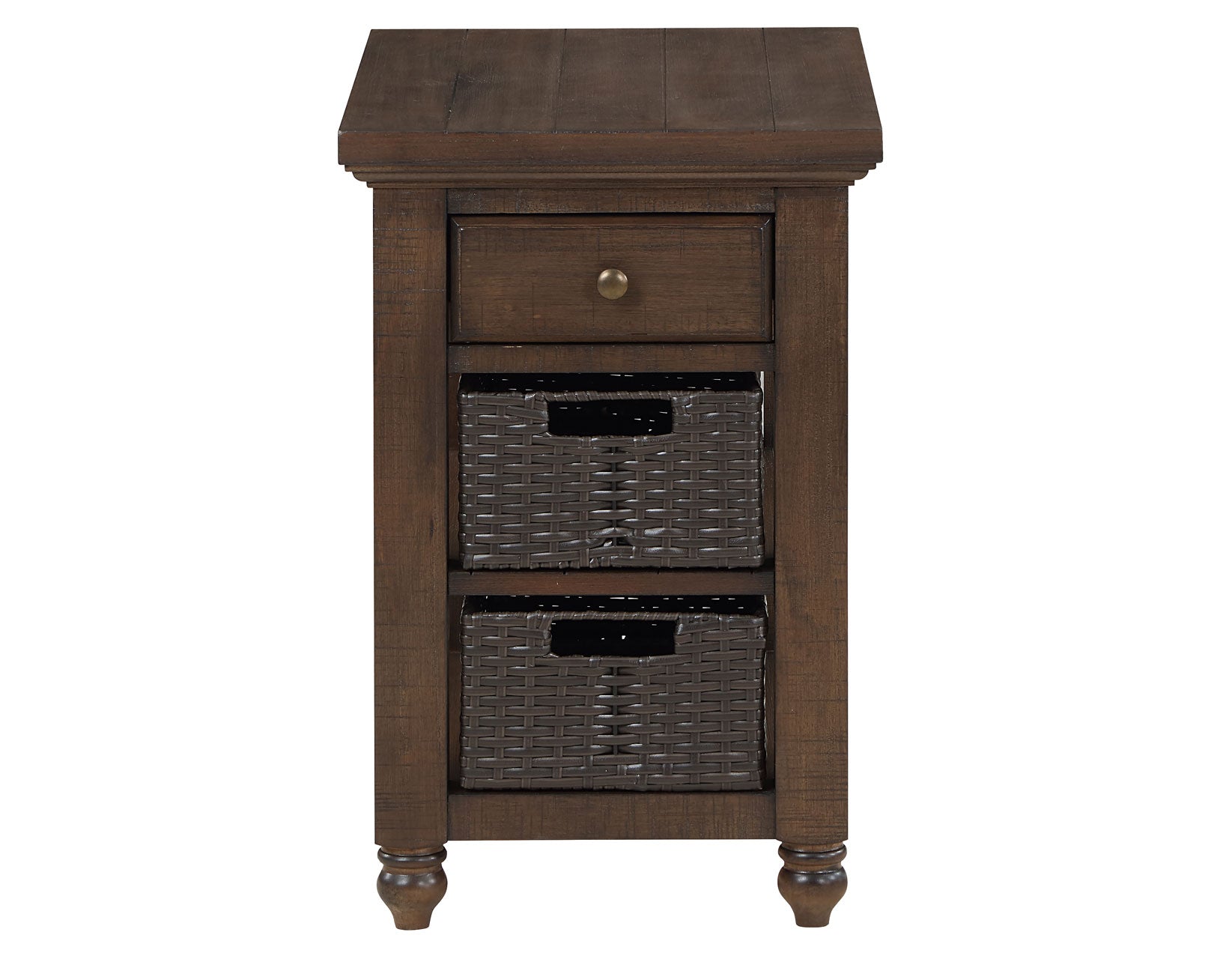 The Oliver Chairside End Table is a delightful addition to any living space, offering bountiful storage in a compact design. Its narrower profile ensures a comfortable fit in tight spaces, combining storage and style effortlessly. With classic styling and two removable baskets, it exudes farmhouse charm while remaining practical. The burnished chestnut finish adds warmth, while details like the turned bun foot, plank top, and beveled drawer front enhance its appeal. Complete with a working drawer, it’s a reliable sidekick, providing both style and functionality in one elegant package.
