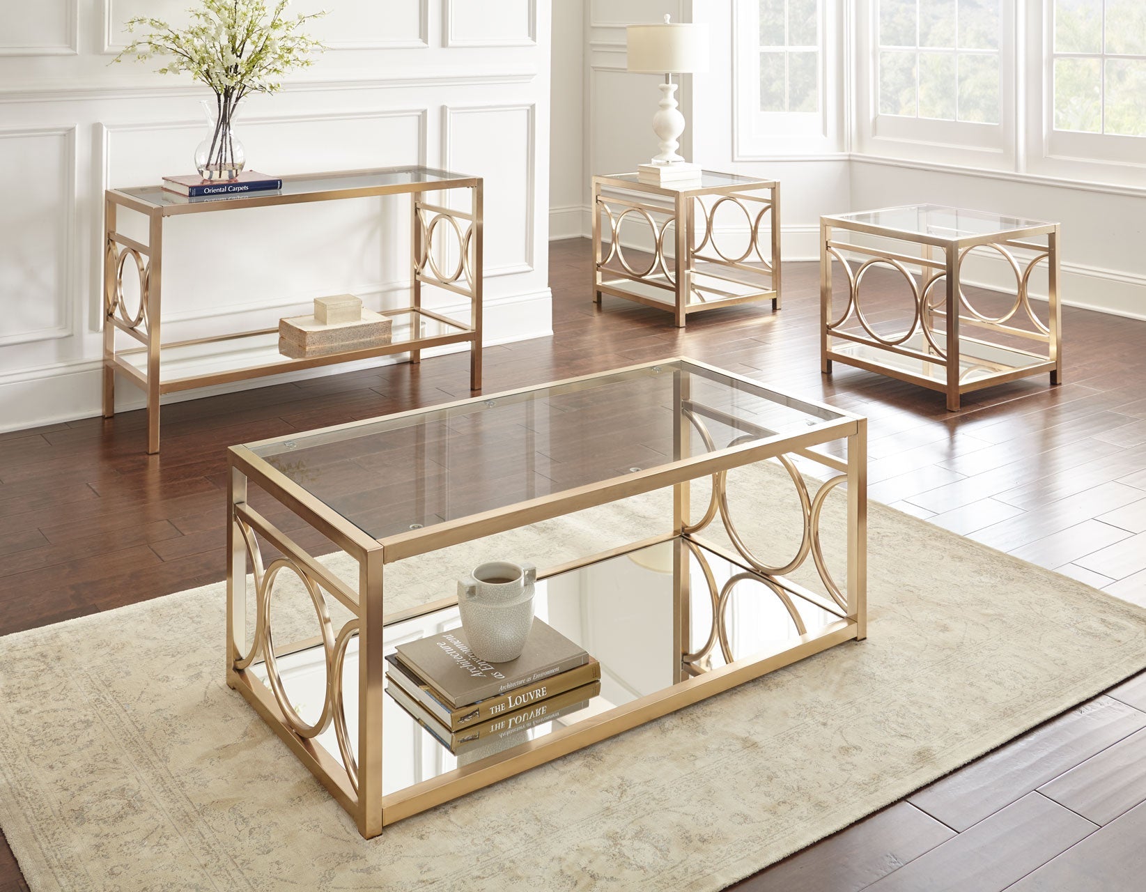 Add a little Hollywood glitz and glamour to your living room with the Olympia occasional tables. Who says your living tables have to be ordinary? This occasional set is sure to steal the show with contemporary styling, gold chrome, glass top and mirrored bottom shelf. Concentric circles on table ends make these tables stand out and are sure to brighten up any living room setting.