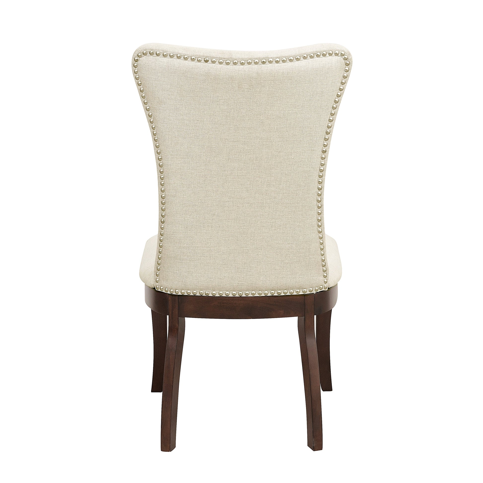 The modern traditional styling of the Oratorio Collection allows the realization of your dream dining room. The side chair features neutral toned fabric and nailhead, complementing the sophisticated design. Cherry finished legs provide complementing contrast.