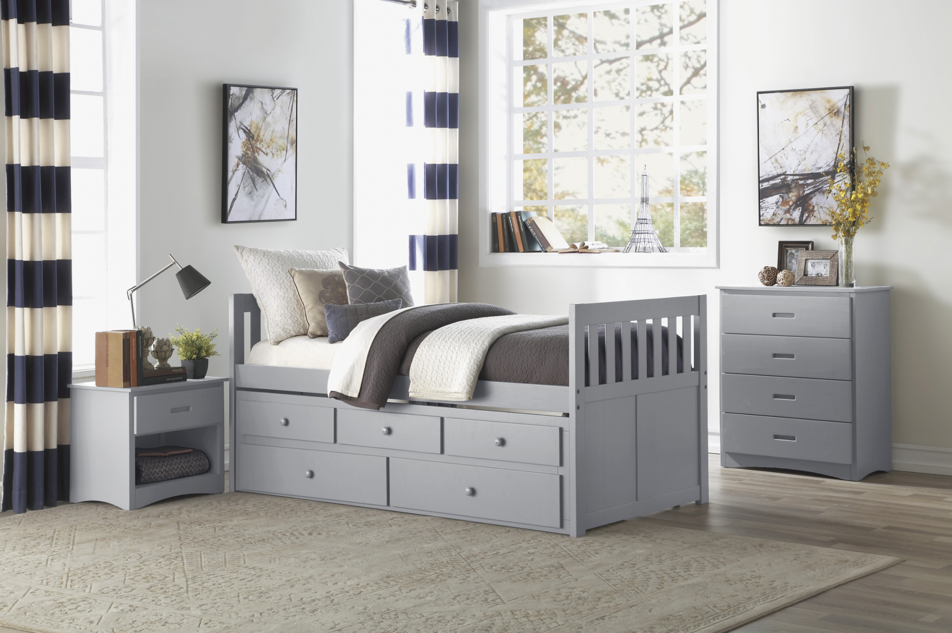 Maximizing sleep space is achieved with the stylish Orion Collection. This transitional twin over twin trundle bed – with two built-in storage drawers - is featured in a gray finish making it an appropriate choice for a number of youth bedroom settings. Also available: twin over twin, twin over full bunkbed, full over full bunkbed, twin over twin bunk with reversible storage stair steps, underbed dual toy boxes, twin trundle nightstand, dresser, mirror and chest.