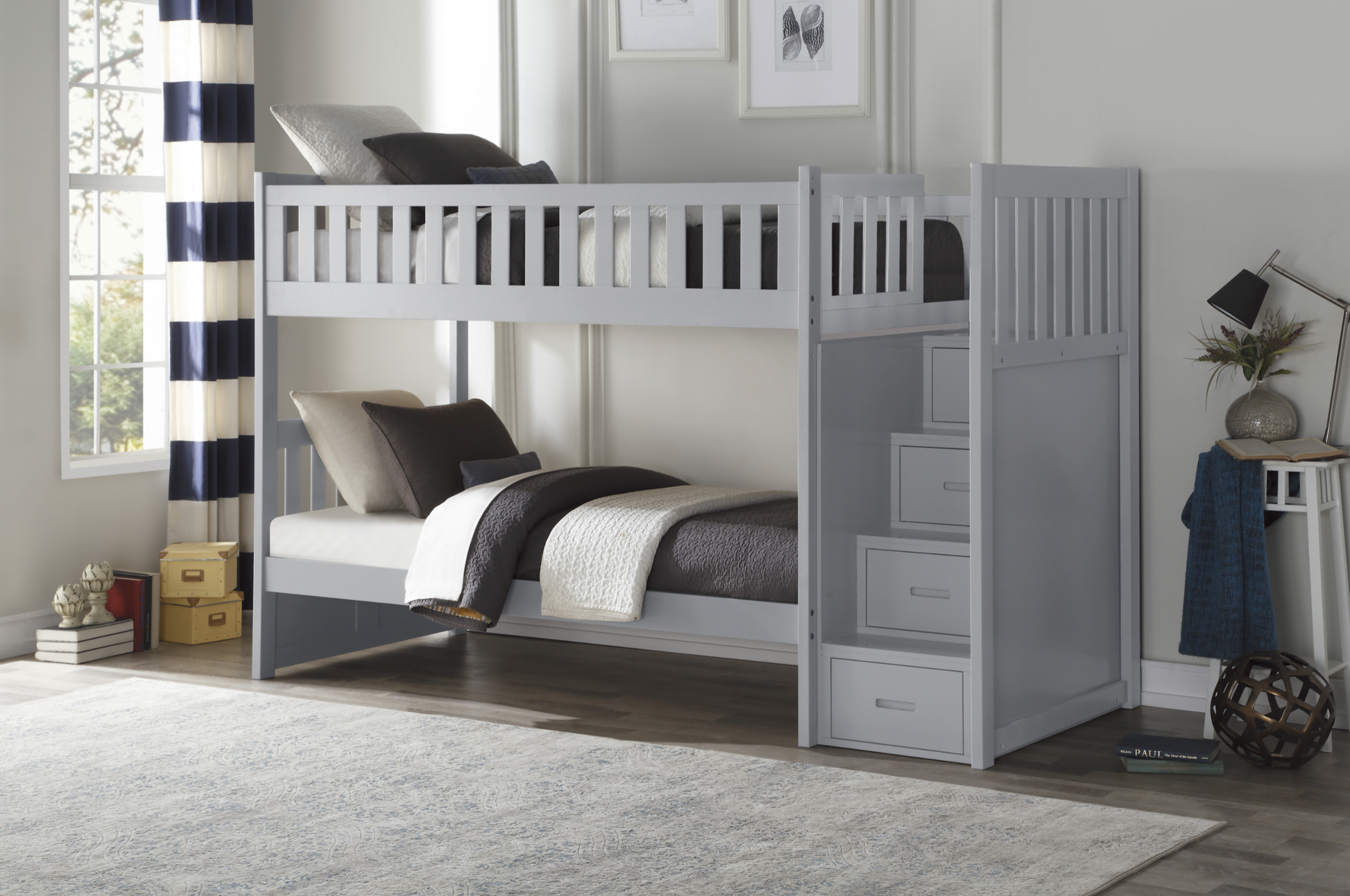 Maximizing sleep space is achieved with the stylish Orion Collection. This transitional twin over twin reversible storage stairstep bunkbed is featured in a gray finish making it an appropriate choice for a number of youth bedroom settings. Also available: twin over twin, twin over full bunkbed, full over full bunkbed, twin over twin trundle bed with two built-in drawers, underbed dual toy boxes, twin trundle, nightstand, dresser, mirror and chest.