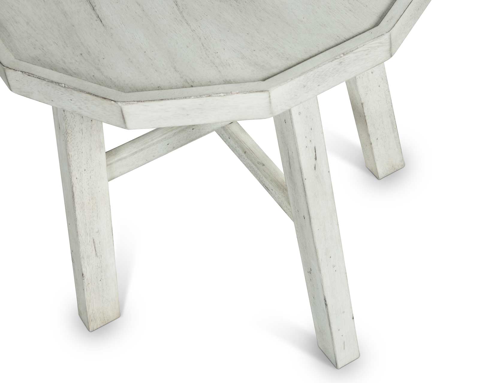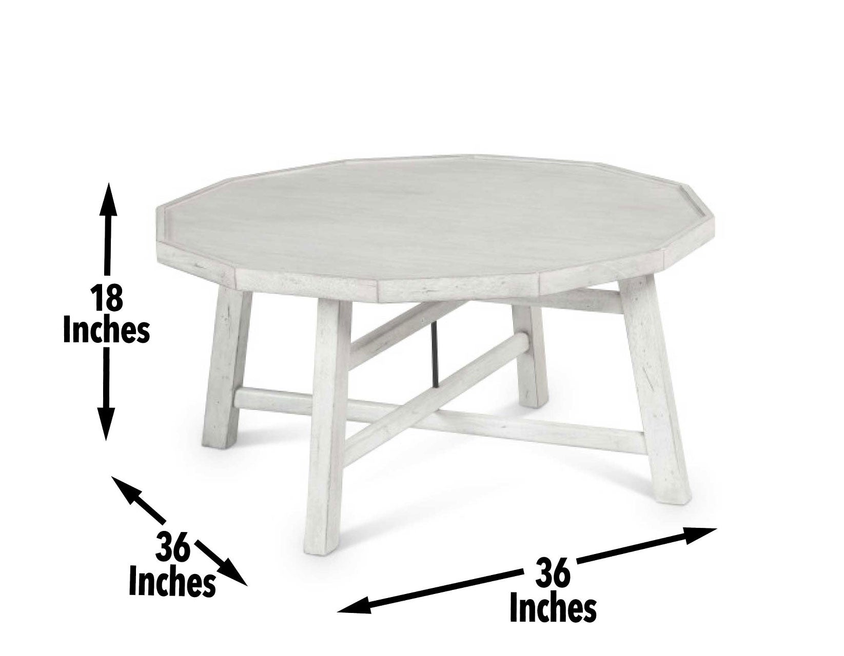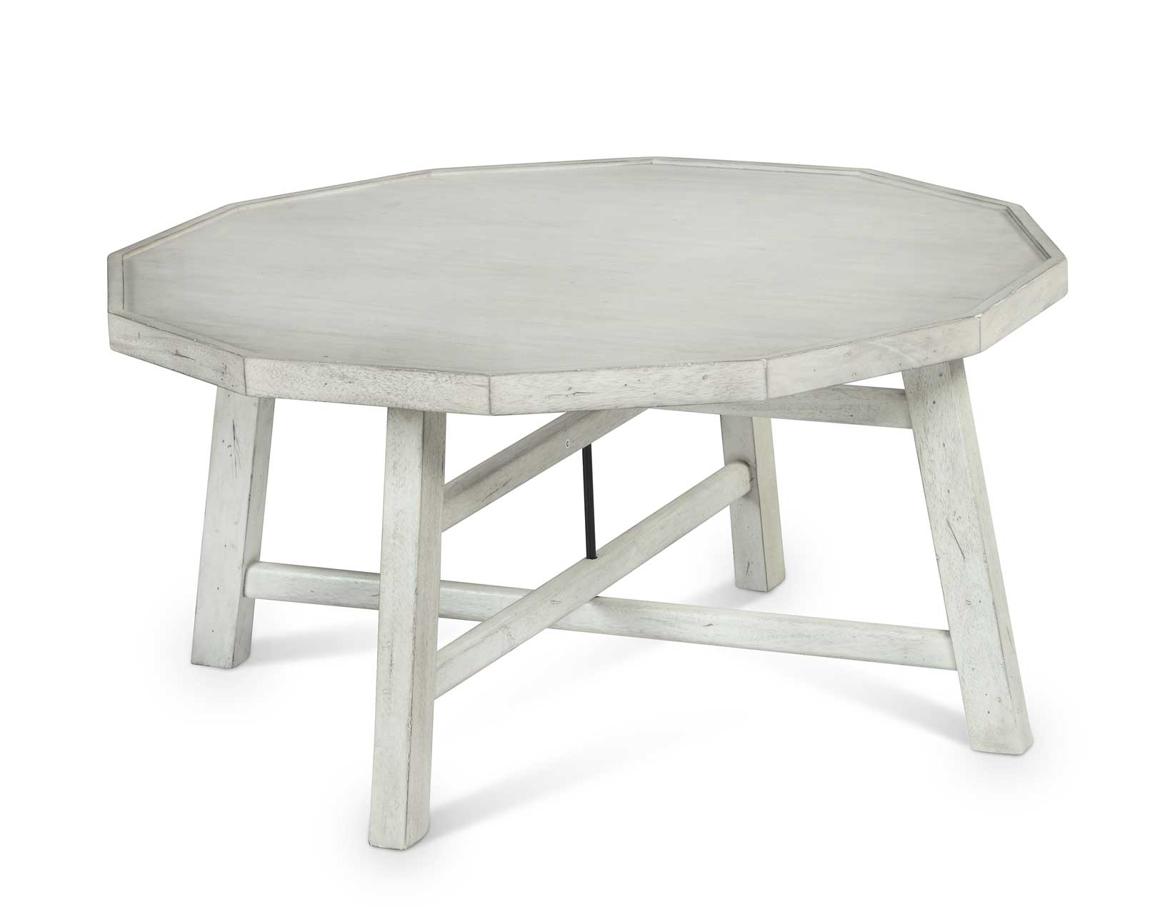 Hand-crafted Cocktail Table built from solid wood and veneers in an artisan alabaster finish, the Paisley Occasional presents vintage styling in a fresh new way. The tray tabletop of the Cocktail Table gives a classic look while also preventing items from rolling off the top. Timber-beam legs feature a cross stretcher design that adds beauty and strength to the piece.