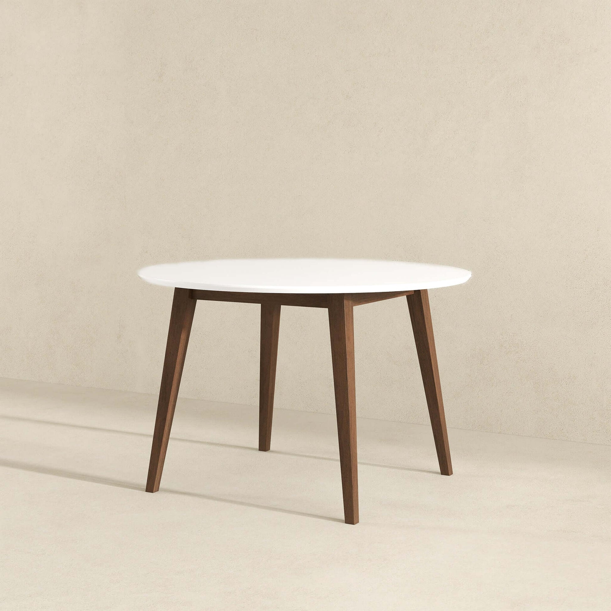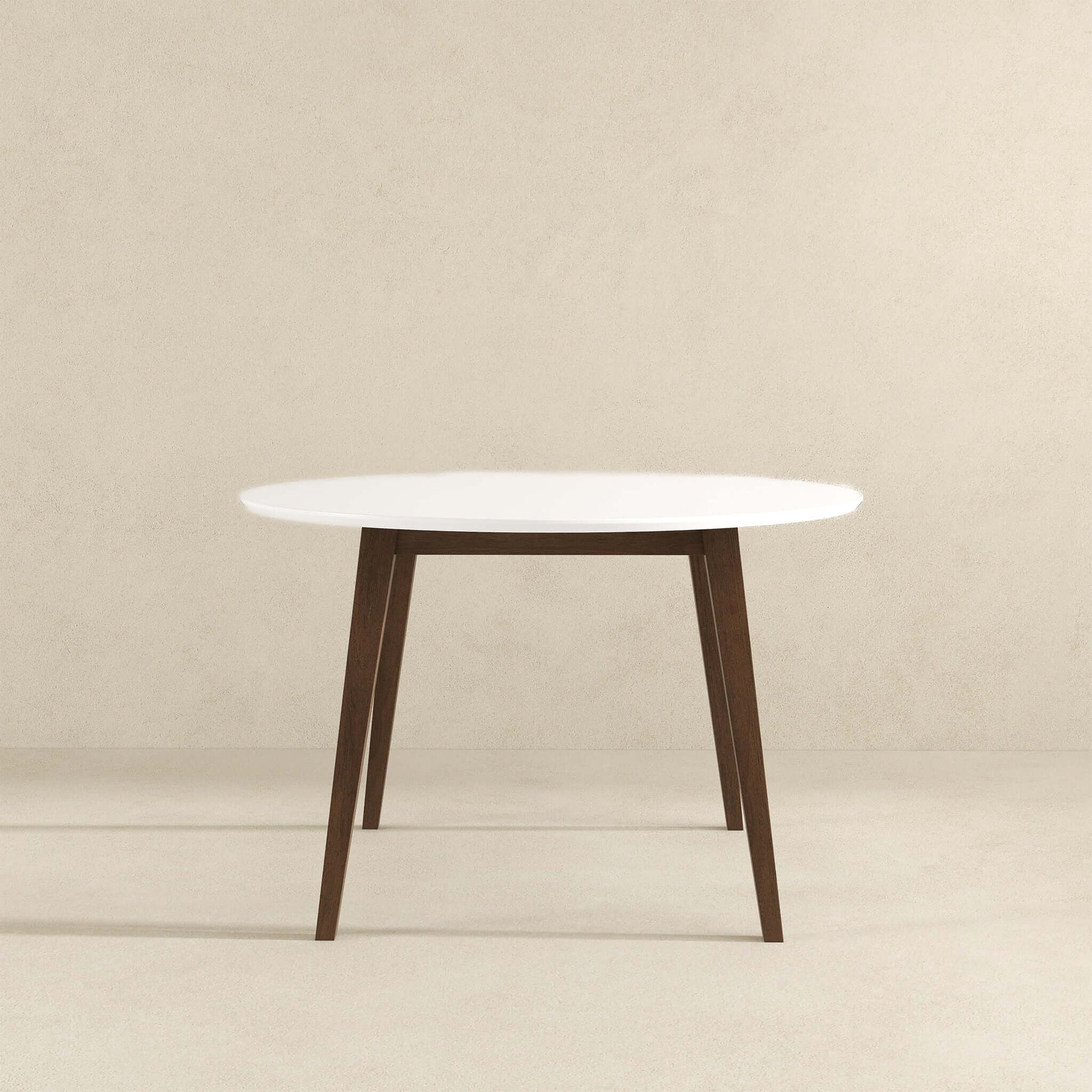 Enhance your dining room with this versatile mid-century modern round dining table. Crafted from durable, easy-to-clean wood, it comfortably accommodates 4 chairs. The beveled edges ensure safety, making it perfect for small kitchen sets. Its compact size suits various spaces like apartments, lofts, condos, and houses. Use it as a living room or breakfast table, or even as a study desk. With water-resistant solid wood construction and sturdy legs, this table offers durability and easy repair. Assembly is a breeze with the included tool and instructions. Experience style, quality, and affordability with this value-packed dining table.