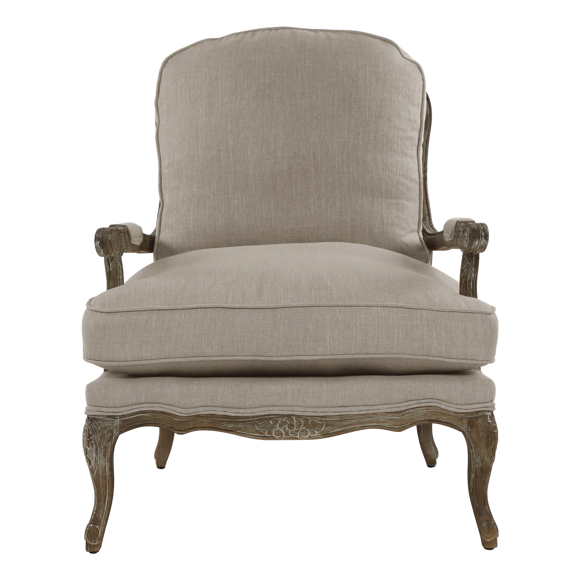 Delicate carvings and a woven rattan back grace the show wood frame in the Parlier Collection. The enhanced texture of the wood grain is highlighted by a gray weathered finish, while a natural color fabric covers the plush feather down seating in this elegant offering. The available coordinating ottoman allows for the achievement of ultimate relaxation.