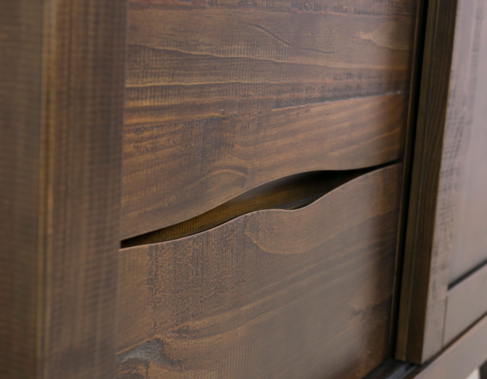 Pasco perfectly combines elements of exotic styling and contemporary design in a solid wood bedroom collection that is both modern and rustic. Drawers feature a live edge that is beautiful and functional for use as a drawer pull. Aspects of mission and mid-century modern style combine for a truly unique style. The Pasco Chest features a sliding door that reveals drawer storage on one side and shelf storage on the other.