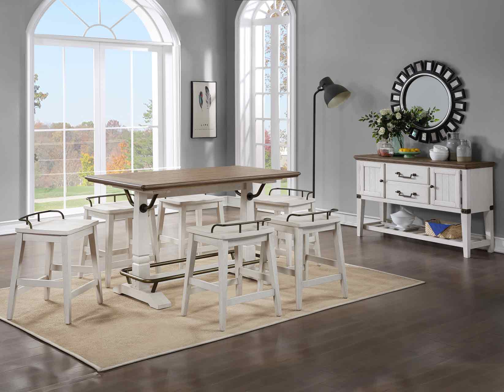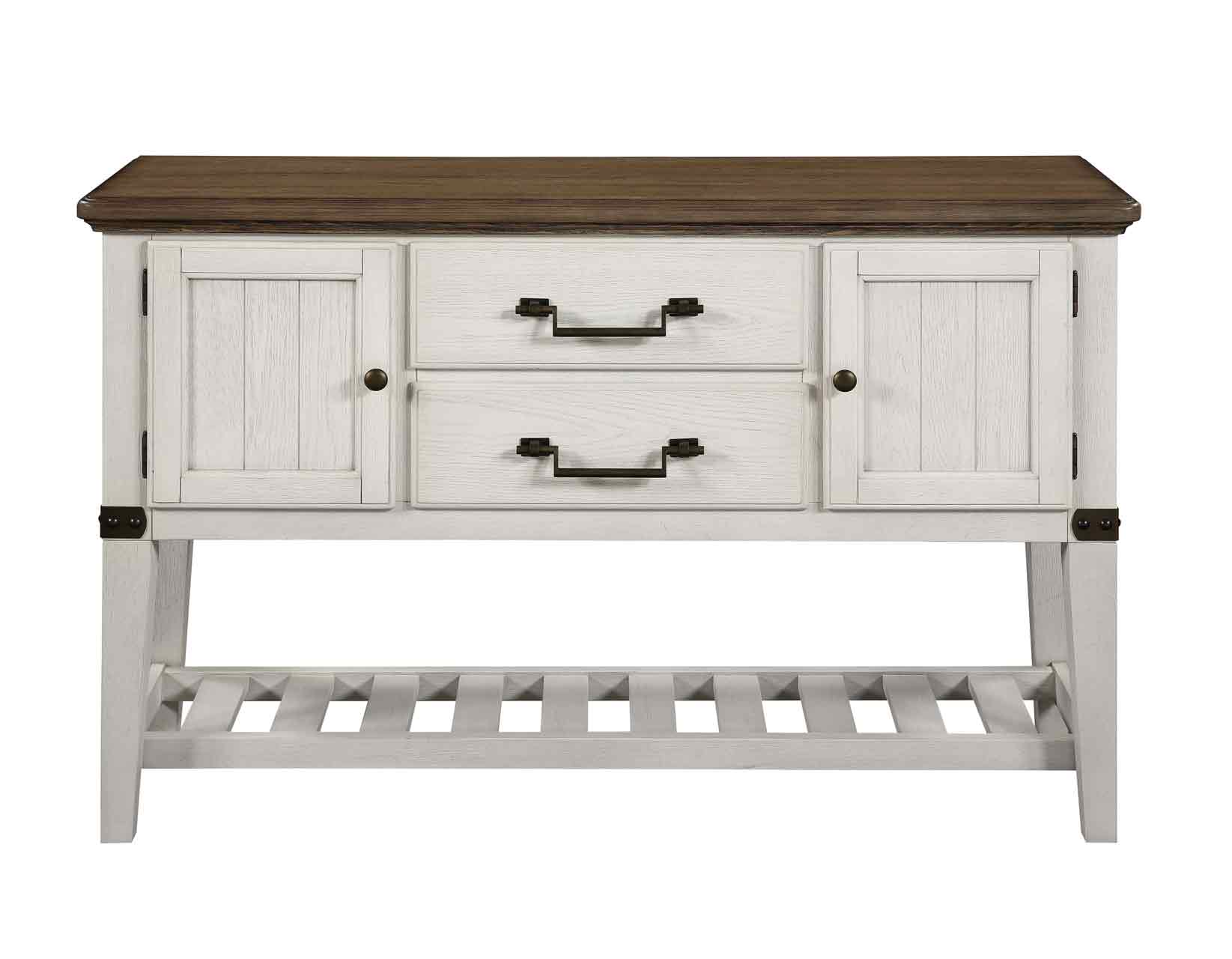 Classic design in a heritage farmhouse style, the Pendleton Server features plenty of storage options in a warm two-tone finish that will work well as a dining, entertainment or hall piece. A plank-effect top gives a treasured heirloom feel to the Server, augmented by the nautical-style bottle storage stretcher base. Oil-rubbed brass hardware complete the style of this farmhouse treasure.