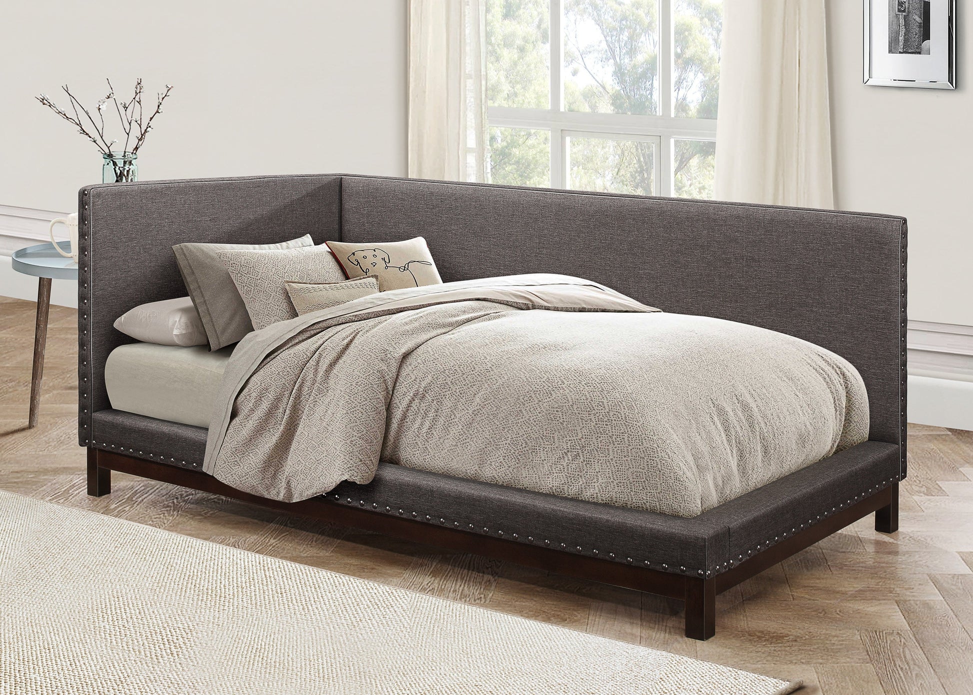Tucking tidily into a corner of your bedroom, the Portage Collection presents as a unique platform for sleep or relaxation. The profile of the corner panels and bed frame feature nailhead accent that complements the dark gray fabric covering. Your mattress will sit atop a low-profile platform that is supported by dark finished wood legs making for a convenient spot to sit or sleep.