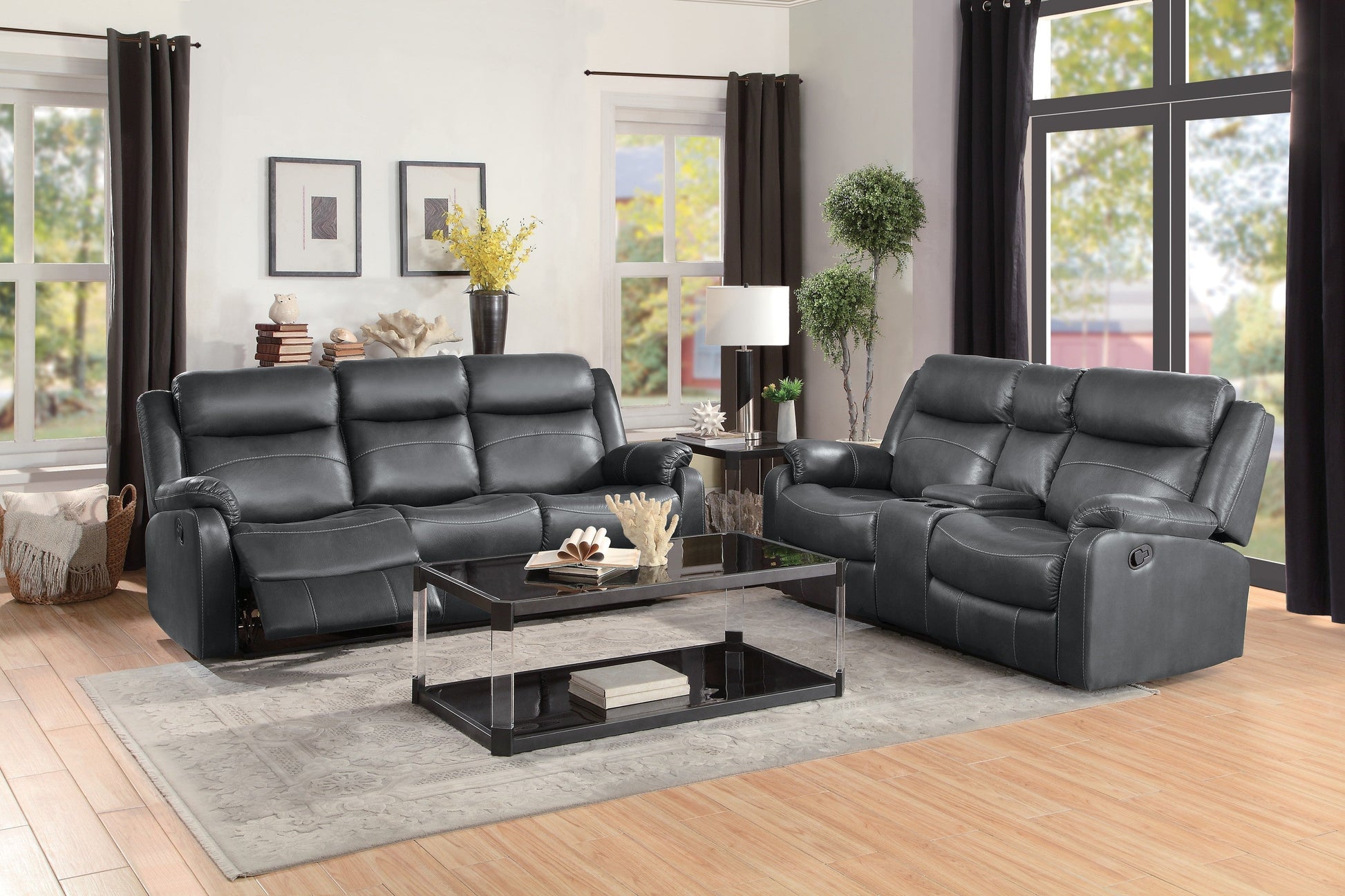 Our Gray Reclining Living Room Set is Designed to make your downtime as relaxing as possible, Grey Living Room Sets the Yerba Collection will be a welcome addition to your home. Optional Dark Brown Sofa or dark gray polished microfiber fabric covers the plush seating of this motion seating group. Function amenities include the unique drop-down back center console and dual reclining ends of the Living Room Leather Set sofa, center console with dual cup holders and lift top storage on the love seat and the accompanying sofa with chairs completes the arrangement with a reclining mechanism. Providing additional function to the collection are the extended reclining mechanism installed on chair, love seat and sofa that allows for further extension than the average recliner.