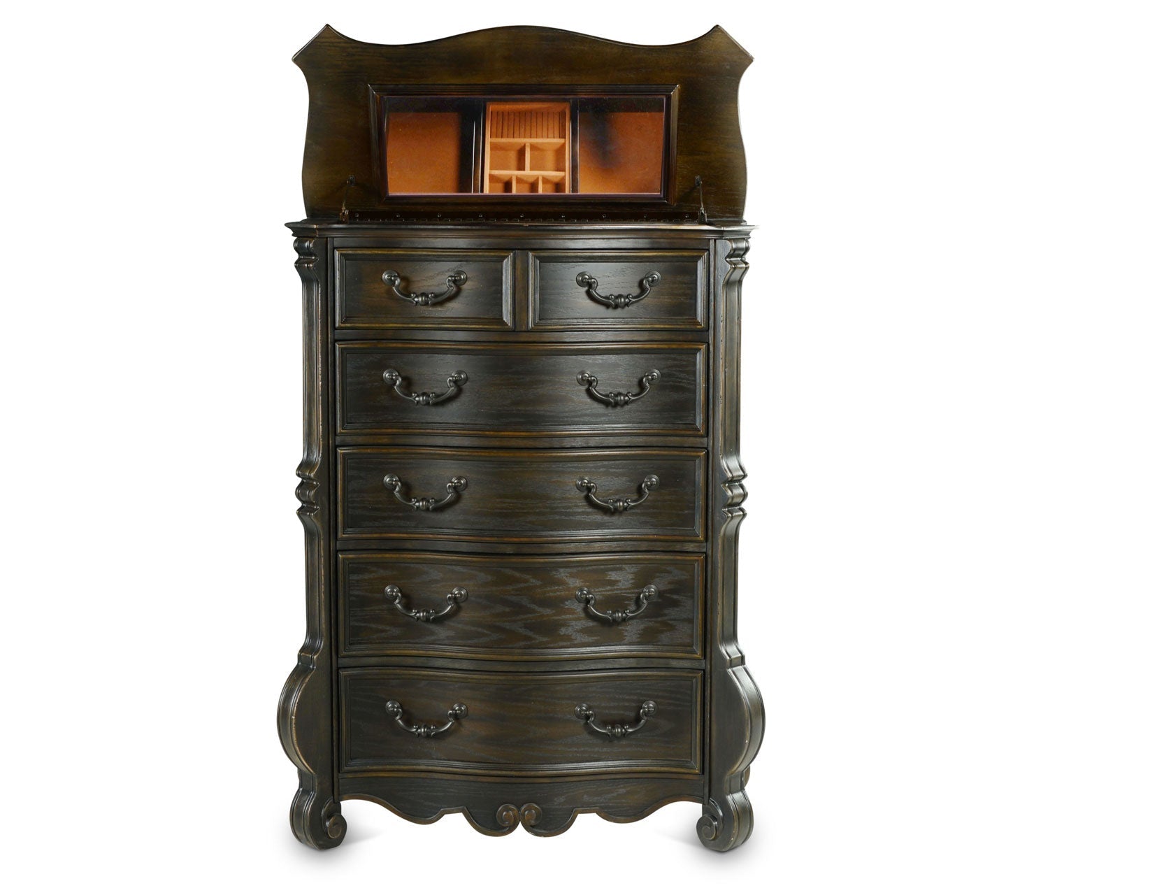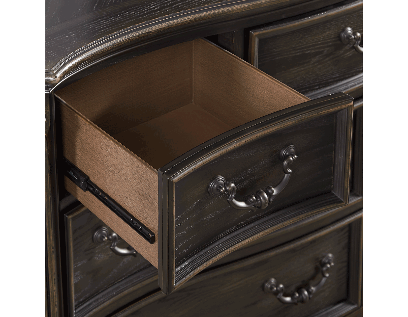 Rhapsody presents a comfortable and opulently traditional bedroom collection in this Panel Bedroom set. The button-tufted Panel Bed sets the tone for this collection with scrolled framework, fluted pilasters, and elevated feet – details that are echoed in the case pieces of the group. The multi-step molasses finish features edge rubthrough that replicates the look of a loved heirloom antique.