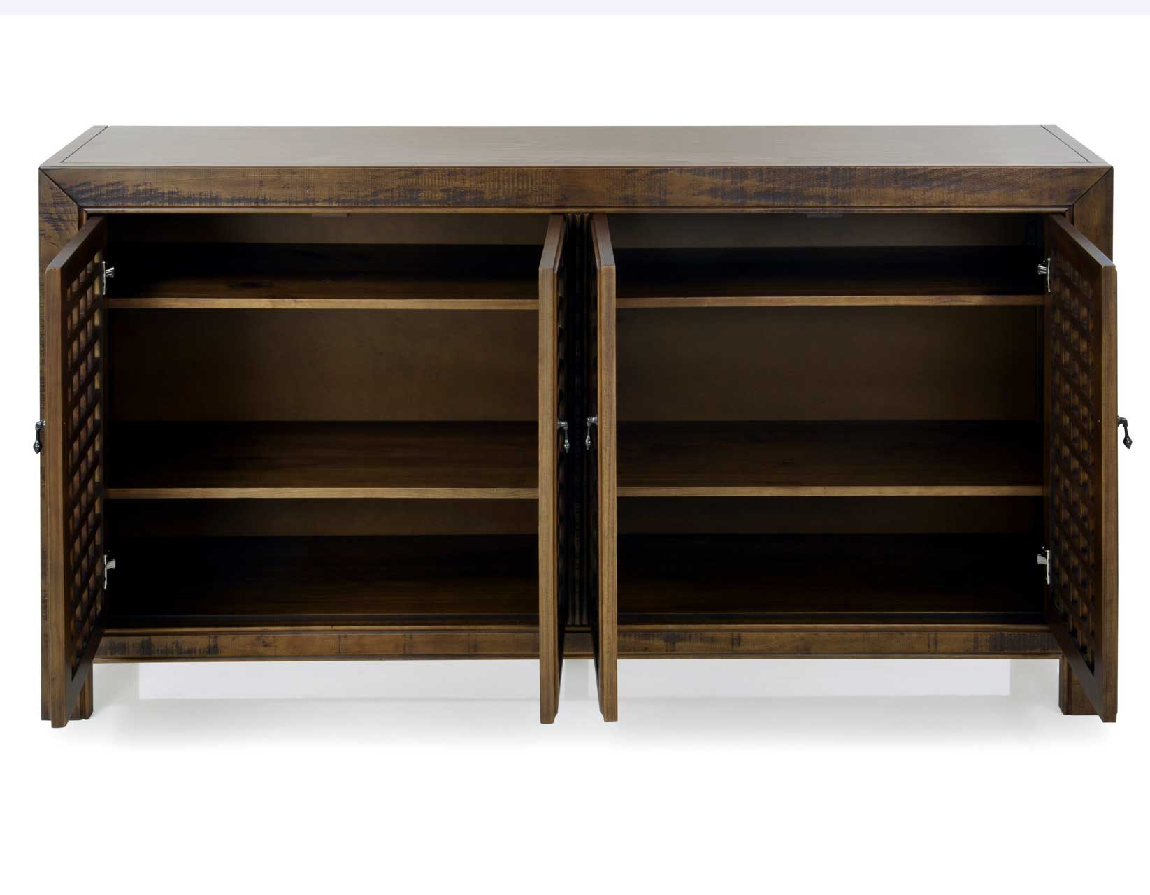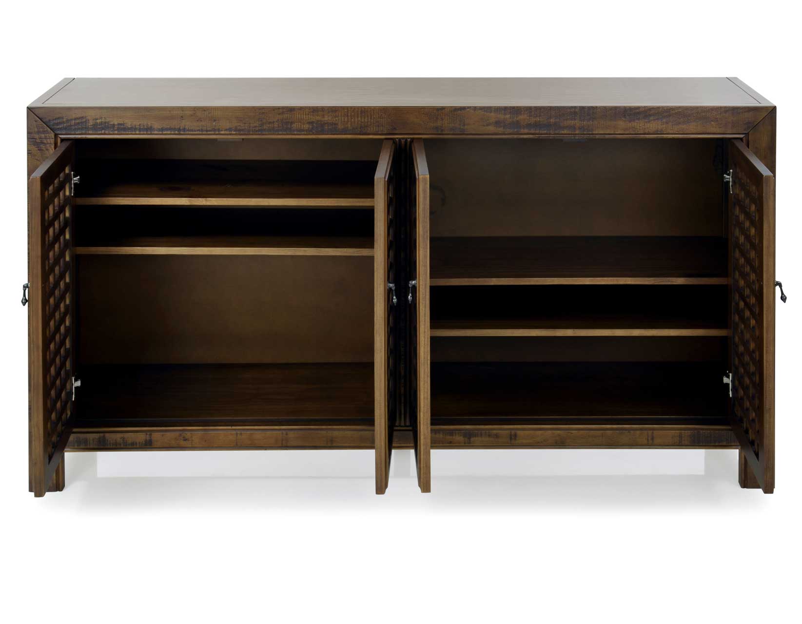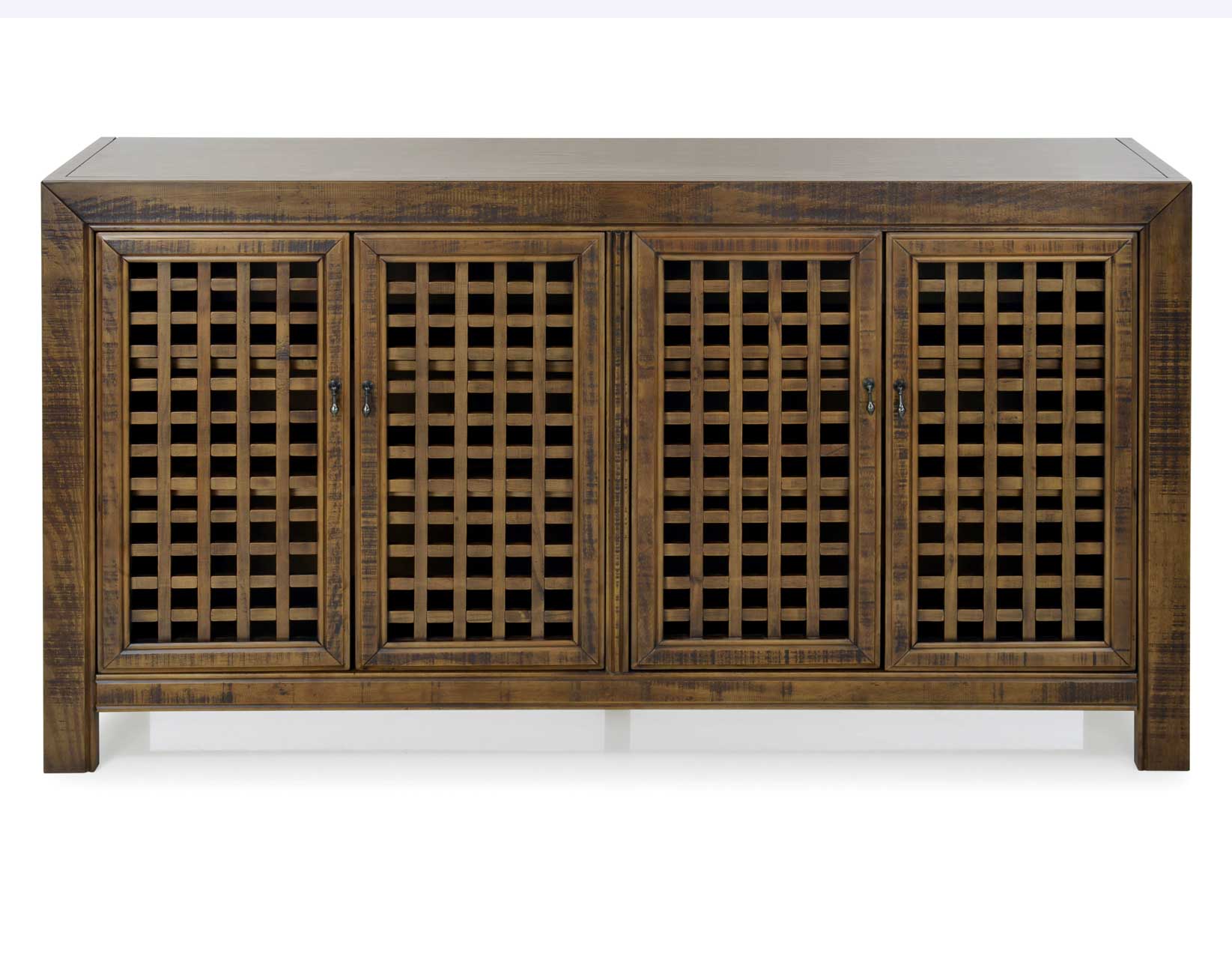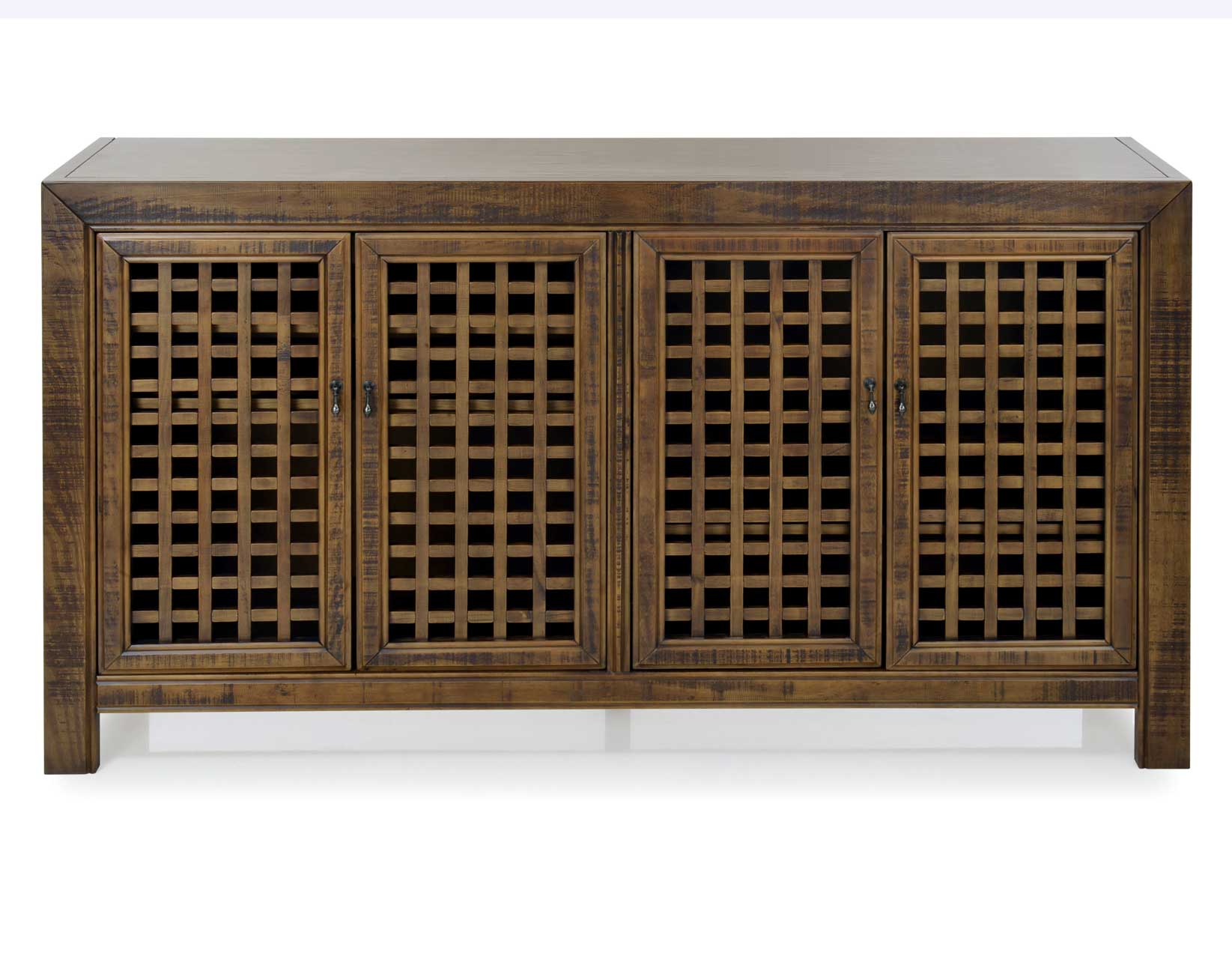 An Accent Cabinet with an heirloom feel and antique pie-safe design, the Rio 4-Door Cabinet is built for today’s home accents and electronics. The 70-inch long cabinet has four adjustable shelves and lattice door fronts for semi-open display or for electronic remote use. A beautiful mocha finish warms the room while the four adjustable shelves ensure you configure the piece exactly to your own specifications.