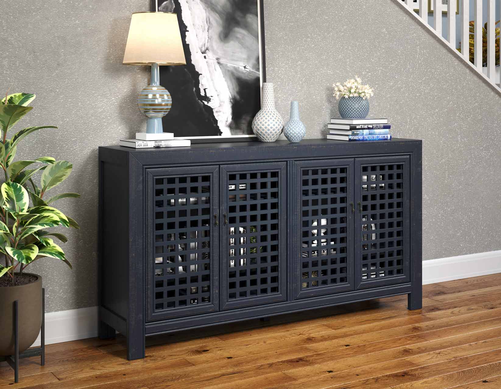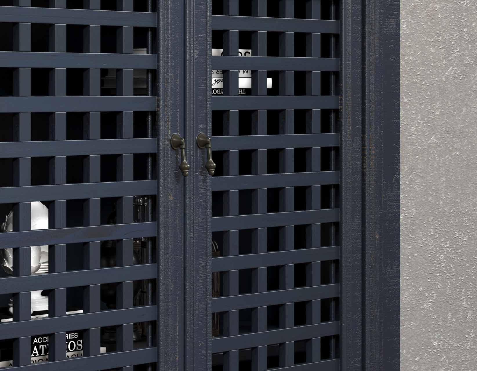 An Accent Cabinet with an heirloom feel and antique pie-safe design, the Rio 4-Door Cabinet is built for today’s home accents and electronics. The 70-inch long cabinet has four adjustable shelves and lattice door fronts for semi-open display or for electronic remote use. A beautiful navy finish warms the room while the four adjustable shelves ensure you configure the piece exactly to your own specifications.