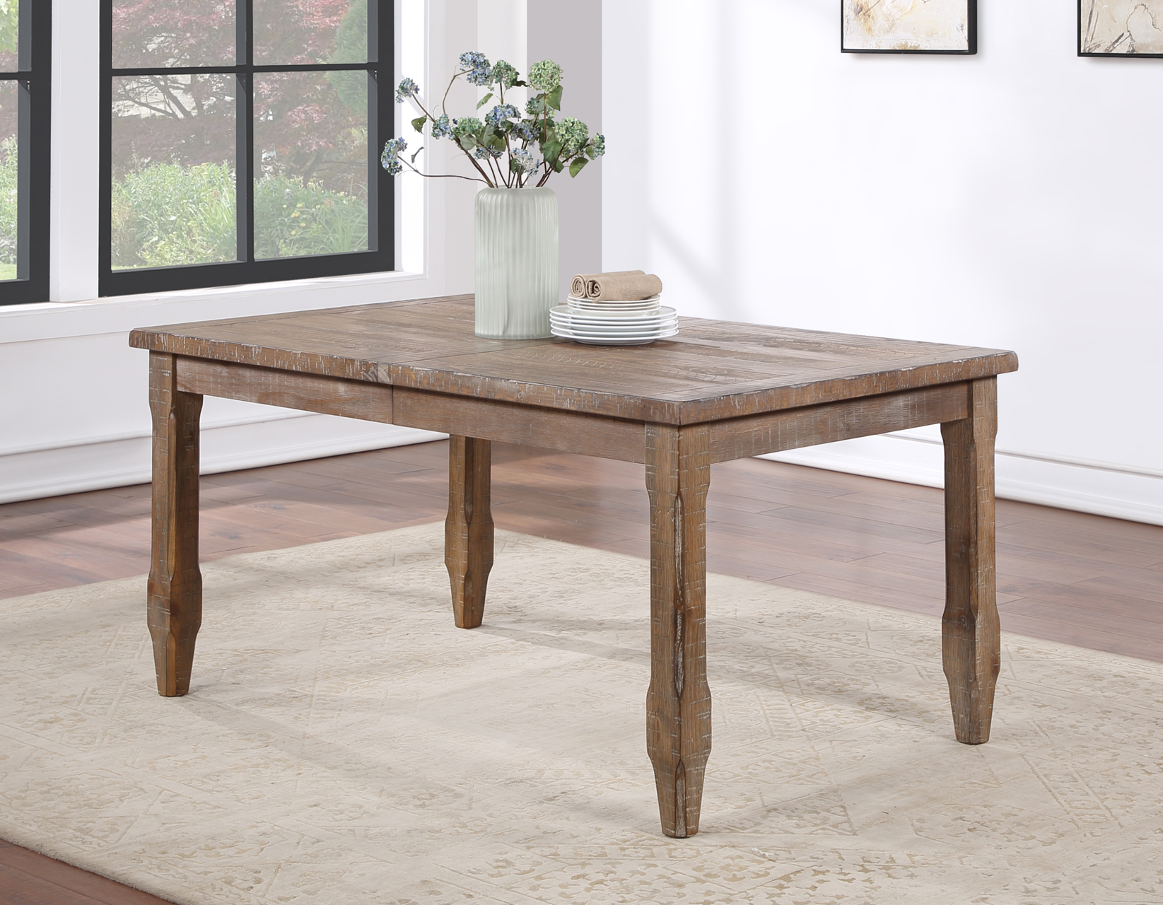 A mix of modern elements and a natural, distressed finish create a casual, relaxed table perfect for today’s dining interiors. The 64-inch table expands to a full 80-inches with the insertion of the included 16 inch leaf to seat eight comfortably. The chamfered, taped legs add a contemporary look to the heirloom feel of the table in a Modern Ranch design comfortable in a rural, urban or suburban setting.