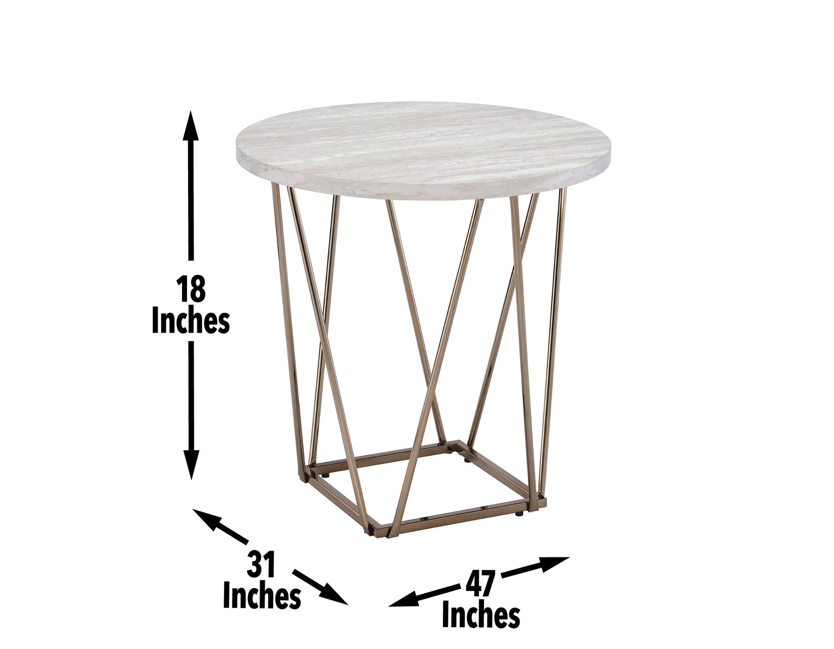 Get an immediate upgrade to your living room with the Rowyn 3-Pack Table set that is a Living Room in a box with a Cocktail Table and Two End Tables included. This contemporary styled collection features a faux white marble top that delivers the look of real marble at a true value price. The scratch-resistant top sits on a beautiful copper-colored hexagonal metal base for a crisp modern look.
