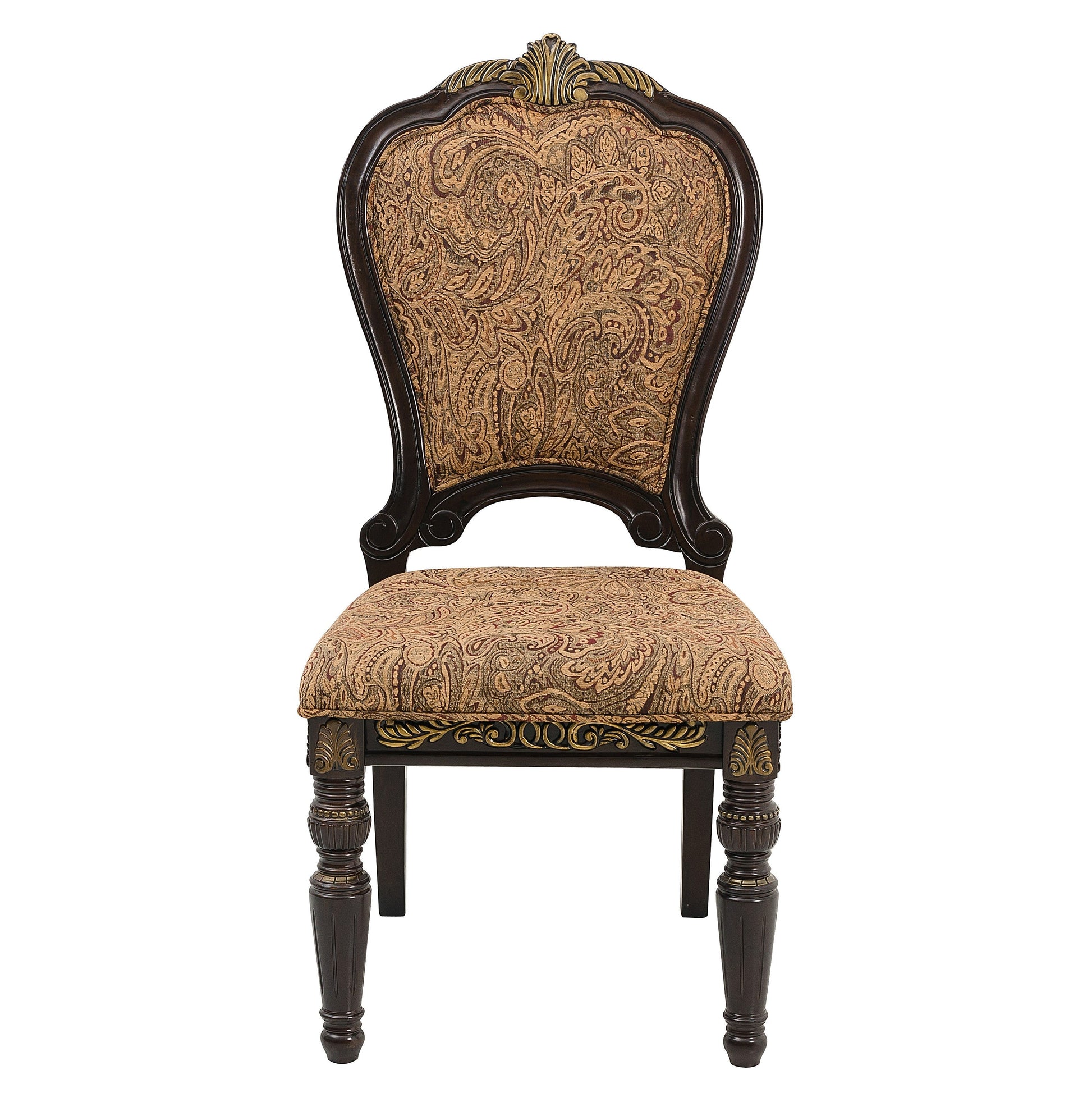 Blending the classic aesthetic of traditional design is the Russian Hill Collection. The nod to Old World styling comes in elements such as dental, rope and bead molding, shell motifs and faux marble accent, this dining collection goes above and beyond to create the desired look. Acanthus scroll design complements the wood frame fabric chairs. The chairs is offered in a traditional warm cherry finish with gold tipping solidifying the interpretation on traditional décor.