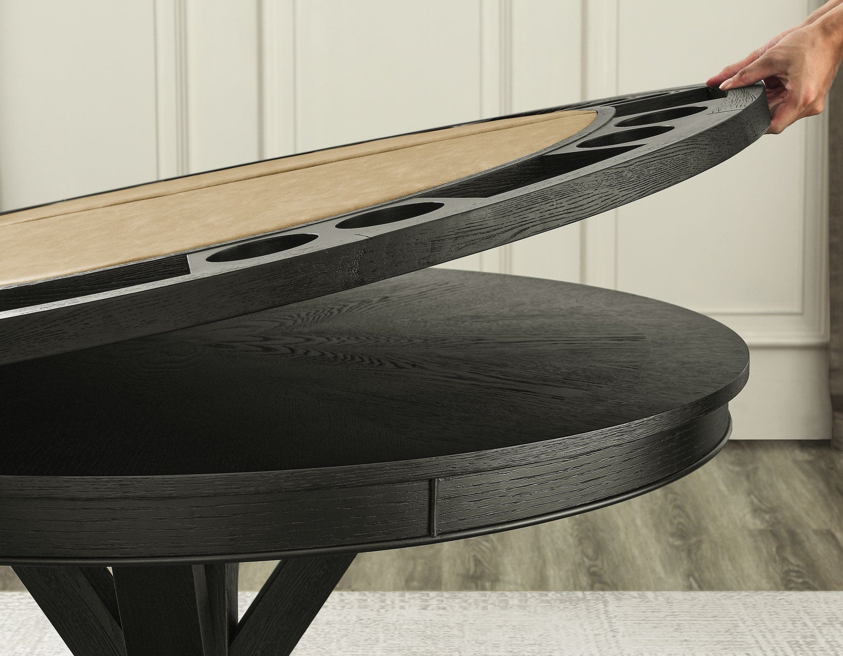 Folding Game Top sits on top of the 48-inch round Rylie table for game night and then can be removed and stored in the included carry bag to use the table for dining
