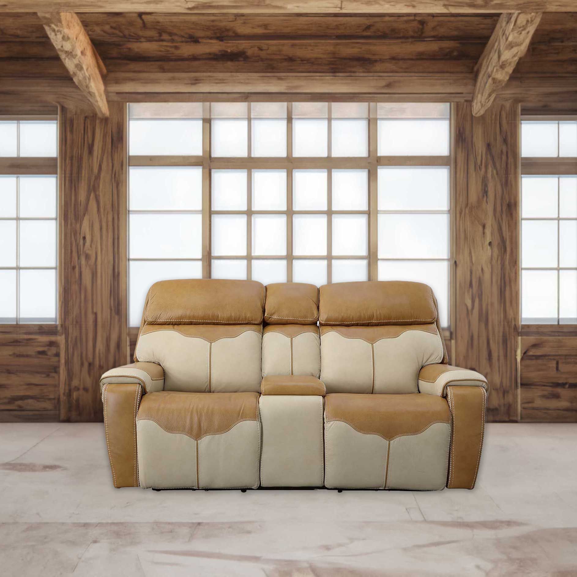 Ranch styling and pure luxury combine in the Salamanca Dual-Power Leather Console Loveseat. Crafted with premium materials and featuring a captivating pattern of burnt orange and cream leather, this Console Loveseat exudes sophistication. The wide seats offer ample seating for two, while the lift-top console provides valuable storage space and doubles as a comfortable armrest. With 2.2 lb. high density foam and an all-steel foundation, it offers unparalleled comfort and durability without racking. And the Console is a real showstopper with a Hidden Dropdown console with two cupholders, USB charger, outlet and overhead light – in addition to the lift-top console! Pair the Console Loveseat with matching pieces or showcase it as a standalone statement. Elevate your living space with this extraordinary console loveseat, the epitome of comfort, style, and practicality.