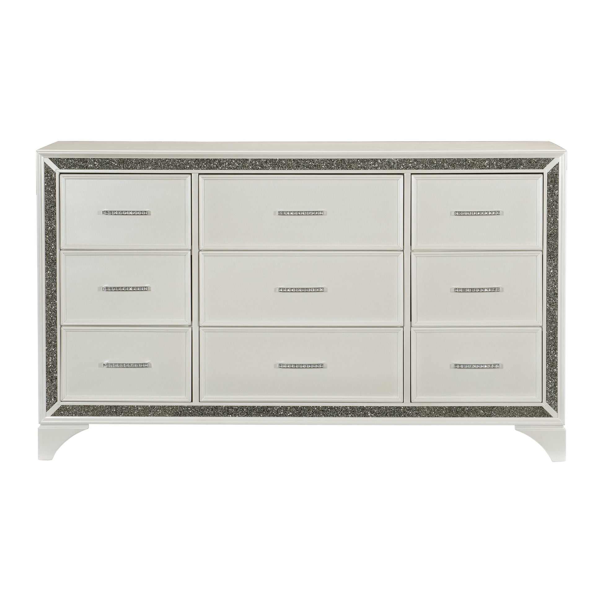 Glamour abounds with the addition of the Salon Collection to your bedroom. The white pearlescent finish is enhanced by the sparkling silver glitter trim that frames the dresser and the faux-crystal chrome bar hardware pulls that front each drawer.