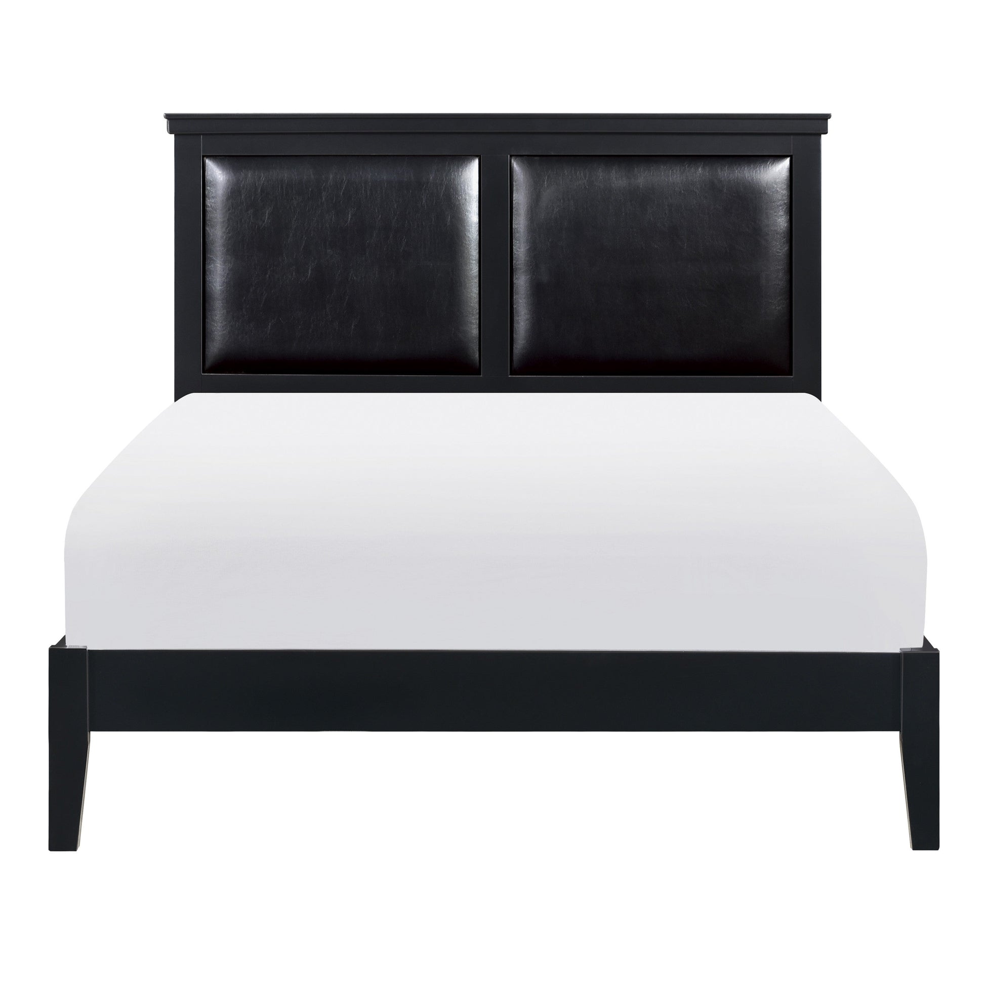 Merging traditional and transitional design creates the look of the Seabright collection, providing a unique platform from which to style your bedroom. The black painted finish allows for exceptional versatility of placement and decorative inspiration. The queen bed features framed, color-coordinated, dual faux leather padded headboard inserts and an ultra-low-profile footboard.