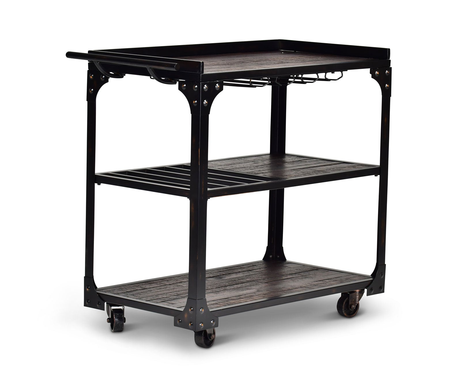 The bar cart in the Sherlock collection offers rustic styling in a rugged mix of hardwood solids and iron with a dark charcoal finish. The bar cart offers plenty of functionality for hanging stemware and bottle storage with casters for easy mobility.Pair with Sherlock tables for a great looking living area combination.