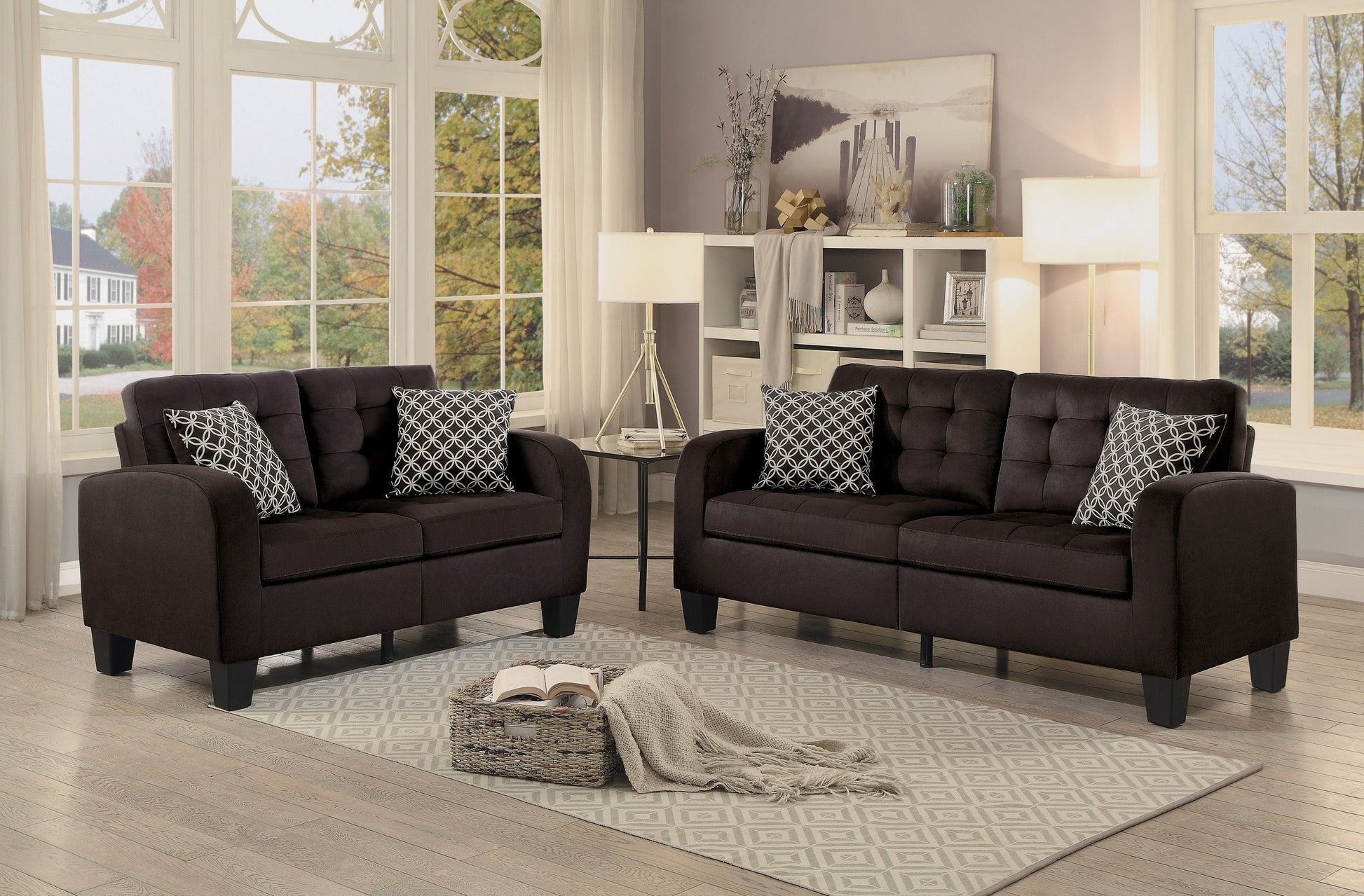 A hint of retro styling provides a clean and classic look for your contemporary home in the Sinclair Collection. The love seat allows for the perfect placement within your living room. Chocolate fabric with contrast pillows that furthers the look and versatility for placement within a number of home decors.