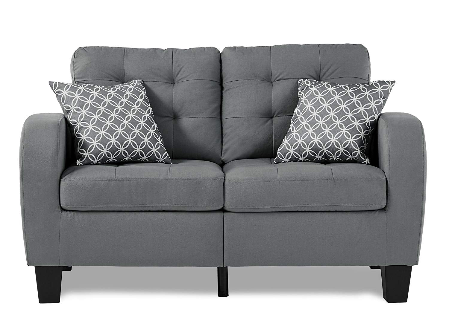 A hint of retro styling provides a clean and classic look for your contemporary home in the Sinclair Collection. The love seat allows for the perfect placement within your living room. Gray fabric with contrast pillows that furthers the look and versatility for placement within a number of home decors.