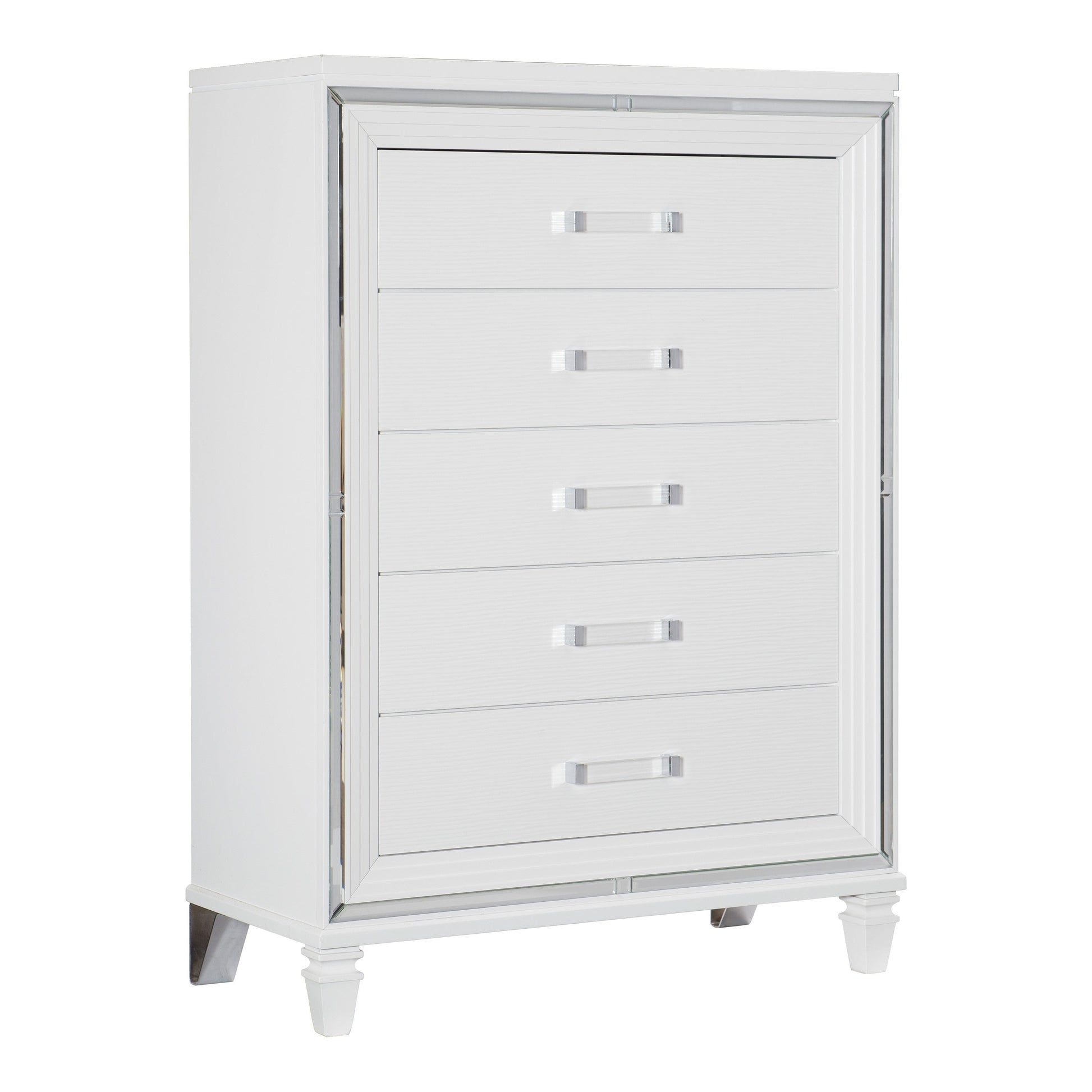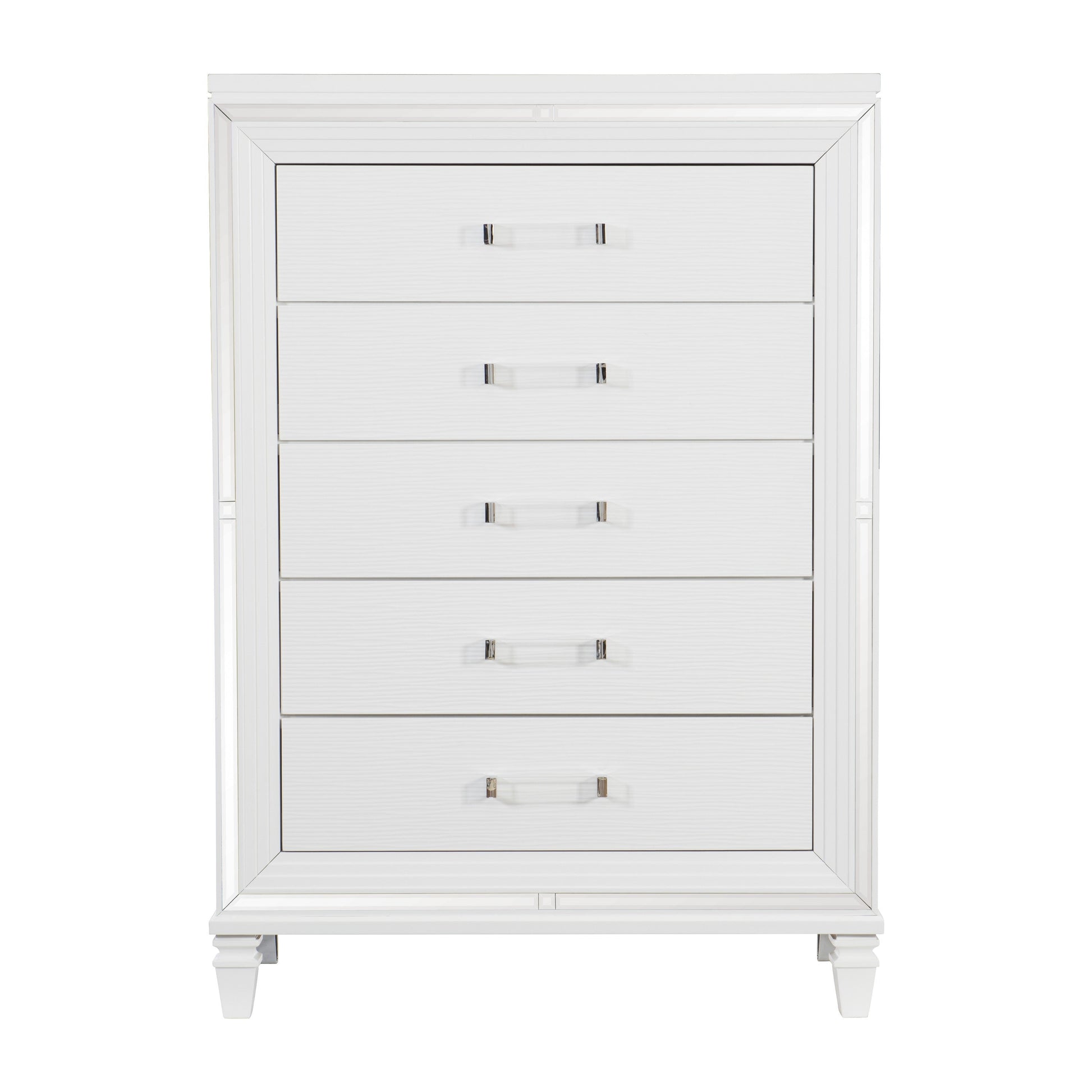 Designed to help your bedroom reach its full glamorous potential, the Tamsin Collection’s unique attributes blend to create a stylish and functional addition to your lifestyle. Mirrored framing provides dramatic enhancement to the chest, illuminating the white finish. Acrylic hardware provides unobtrusive decorative touch to the drawer fronts of the chest.