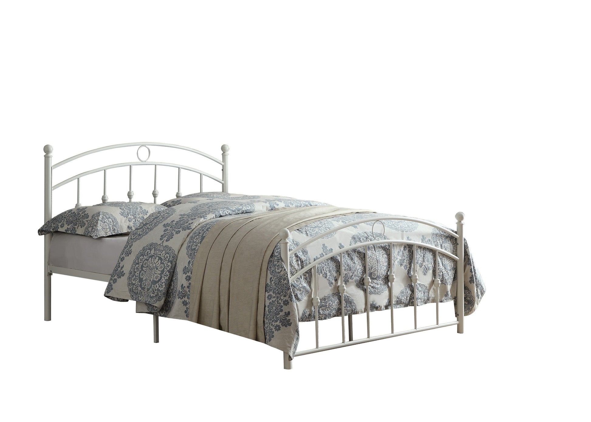 The arched panels of the twin size headboard and footboard create eye-catching drama in the Tiana Collection. The white finish along with ball finials and the circle motif - that centers the headboard and footboard – all lend to the traditional look of the collection. Full bed size option is also available.