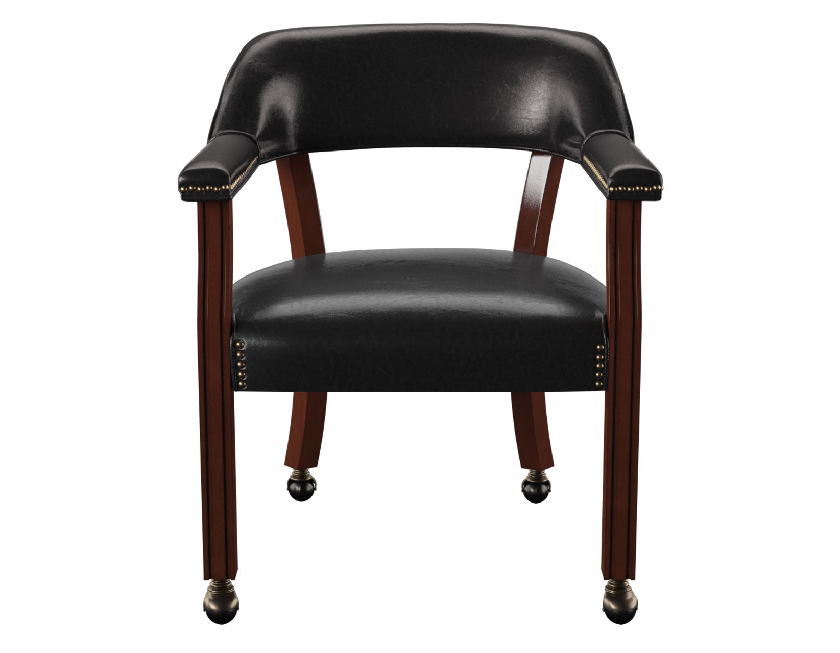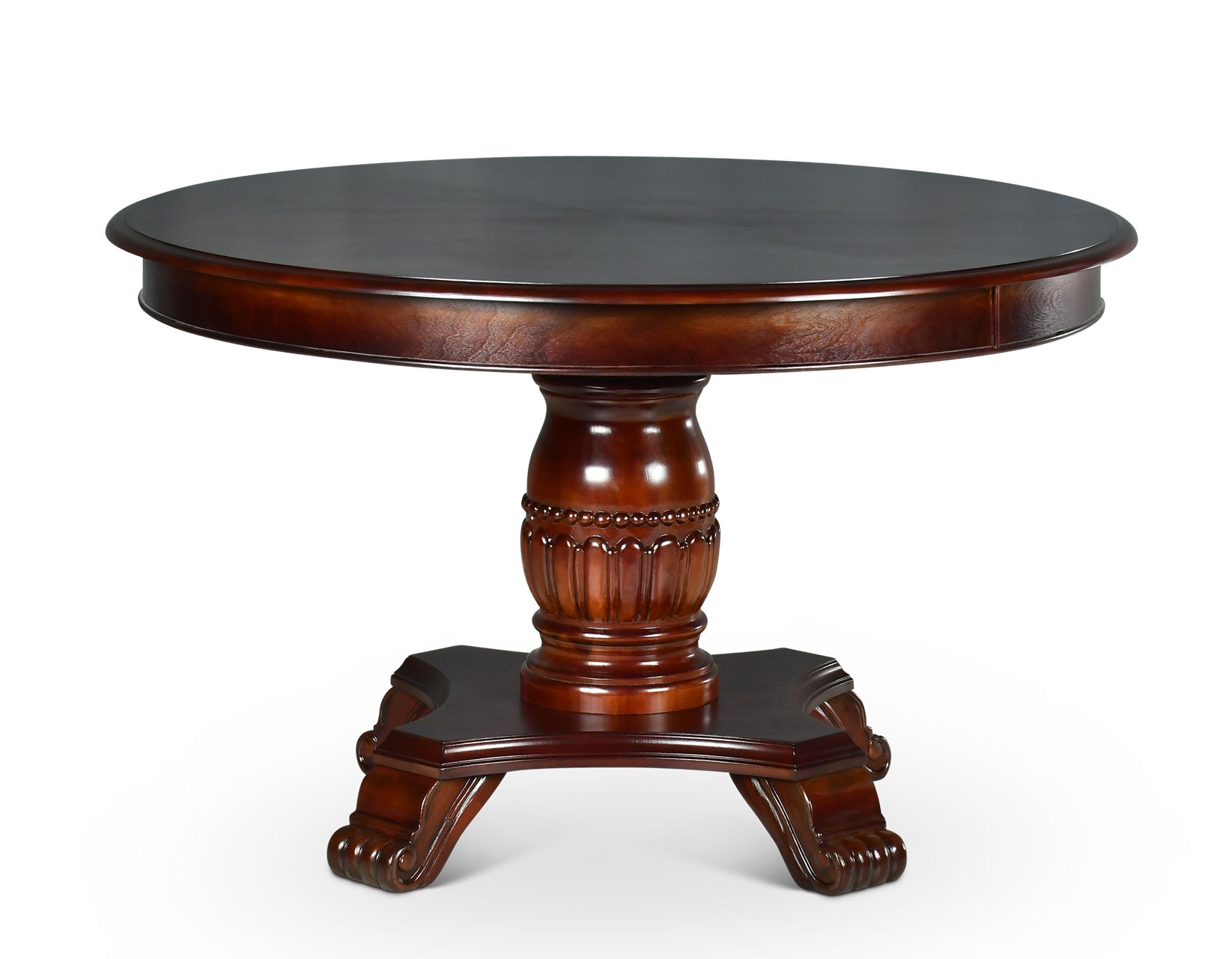Enjoy both game night and dining nights with this dual-purpose dining and game table. The 48-inch round table comes in a medium cherry finish and can accommodate four comfortably for dining. The table easily converts to a game table with the addition of the game table-top that is available in black faux-leather (as shown) or brown faux-leather. The game top folds and stores easily and the table goes back to a dining table. The upholstered.faux-leather captain’s chair is castered for easy mobility and comes in a wide range of colors perfect for every decor.