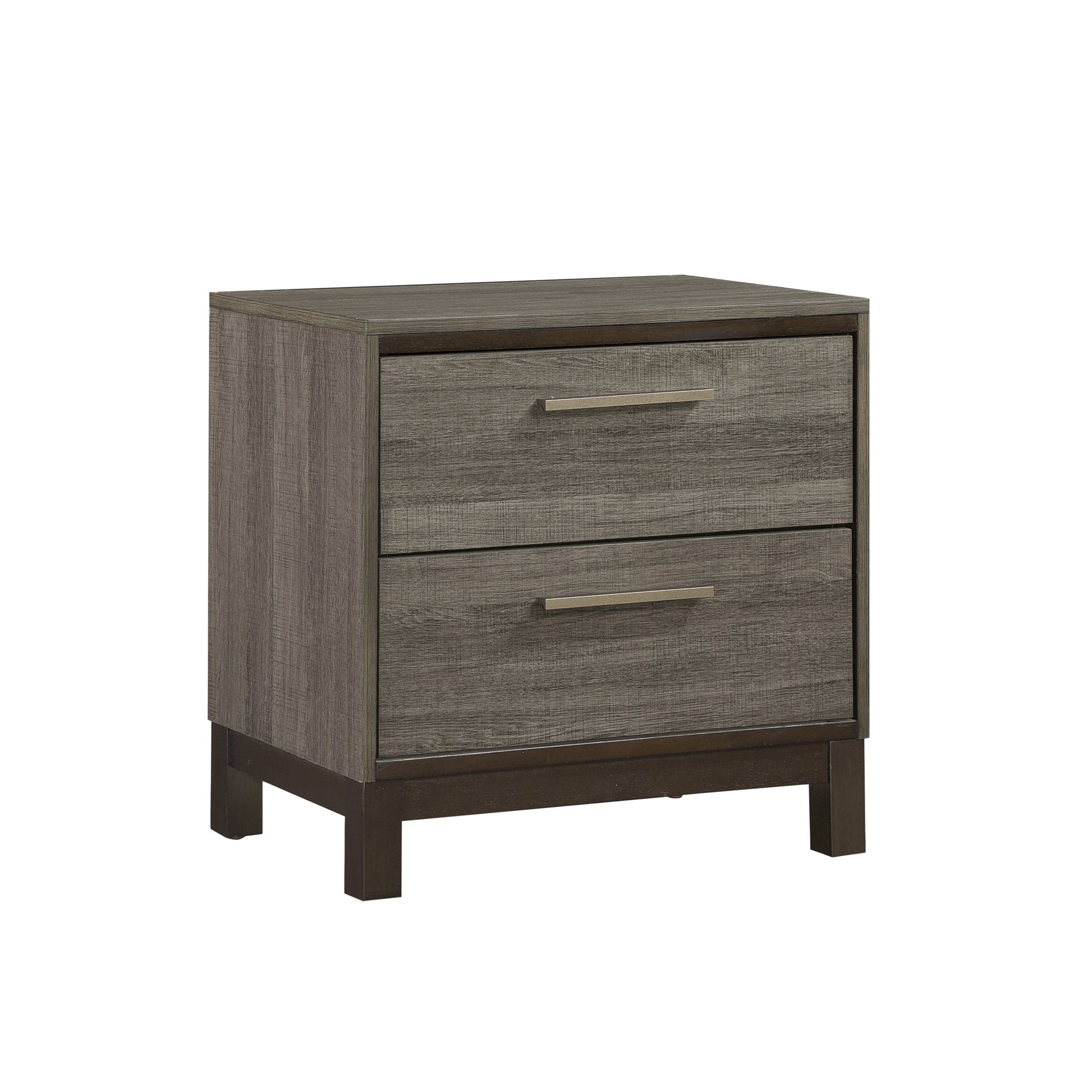 The contemporary styling of the Vestavia Collection provides a unique platform from which to redecorate your bedroom. Faux wood printed veneer provides subtle texture and a gray finish perfectly contrast the dark brown base rail of the nightstand. Clean lines lend to the angular modern look and are enhanced by the antique brass tone bar pulls.