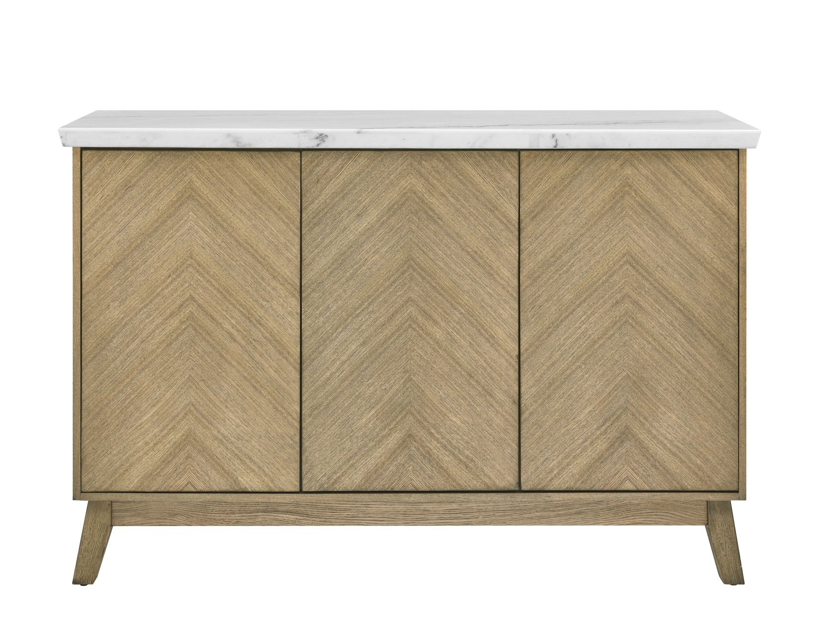 Clean modern lines and a knife edge marble top are the hallmarks of the Vida Marble Top Server. Soft touch doors are free of distracting hardware pieces creating a streamlined profile that allows the burnished blonde finished ash veneers to show through in a striking chevron pattern. But the beauty is not just skin-deep, behind the soft close doors are three adjustable shelves to accommodate bottles and storage of different heights allowing the perfect hidden storage for dining items. Whether in a dining, hallway or as an accent piece, the Vida Server offers clean modern style to accessorize any room.