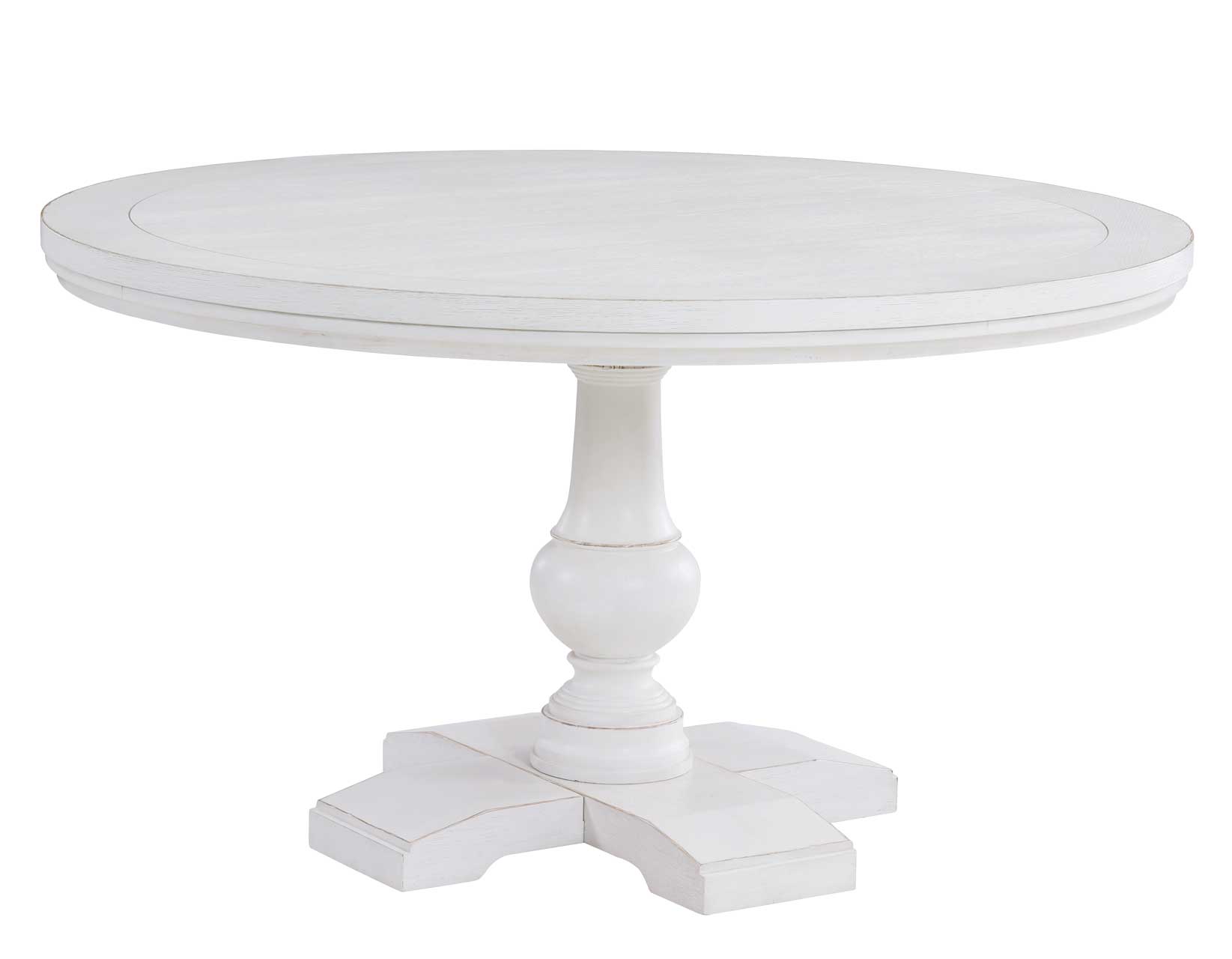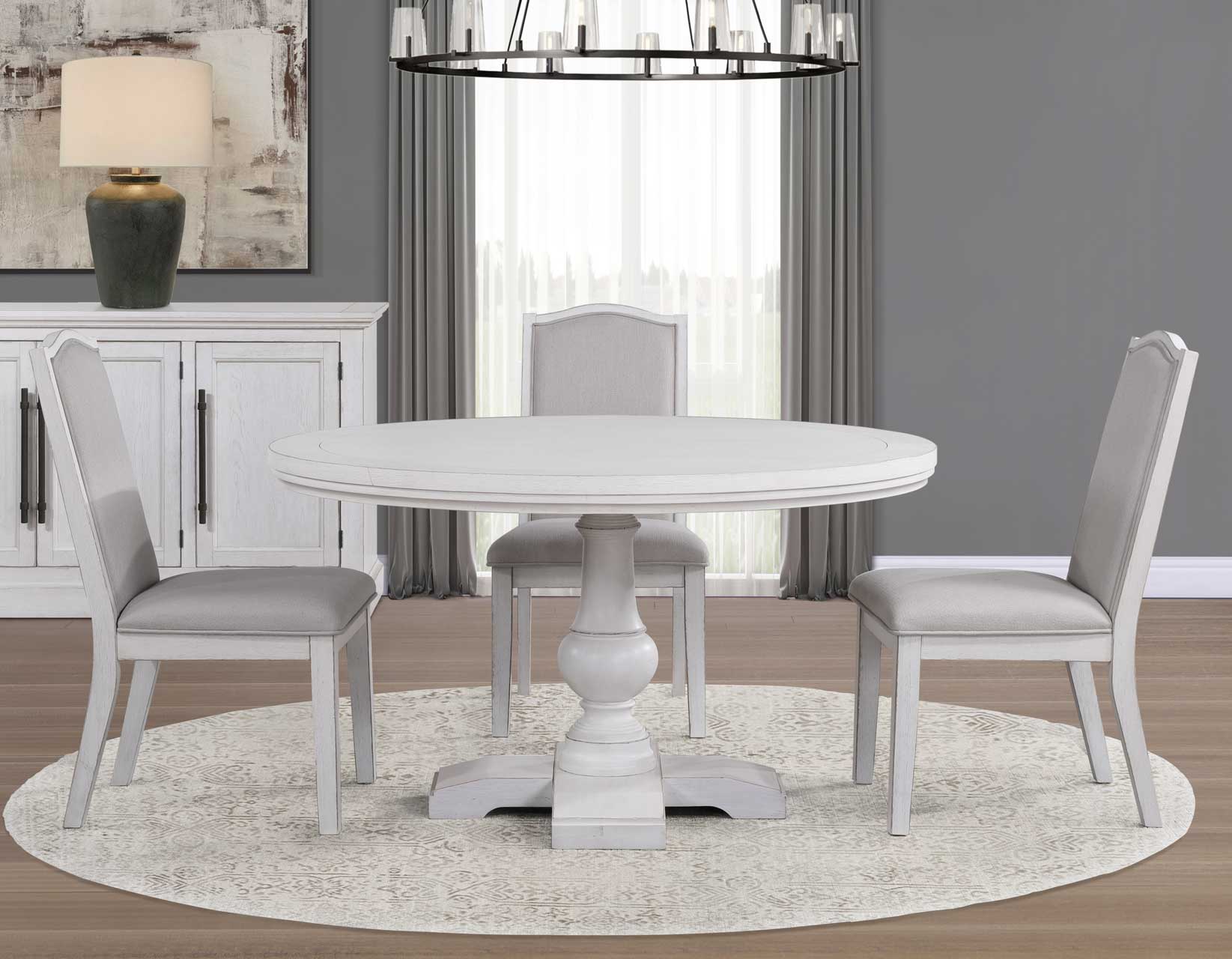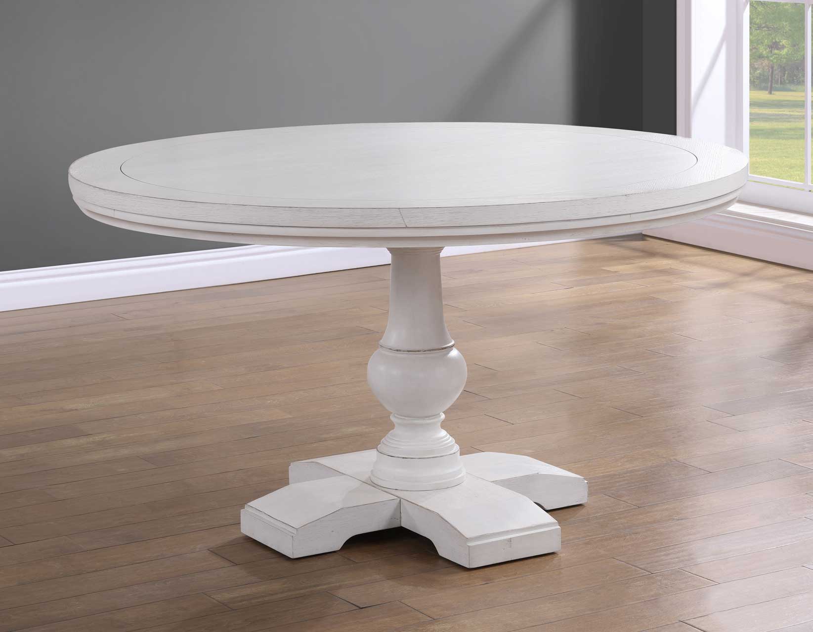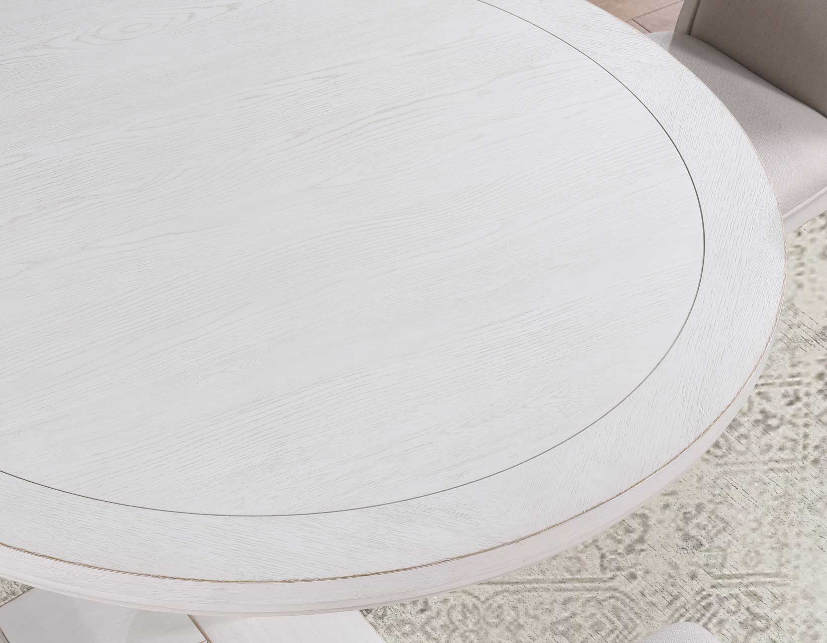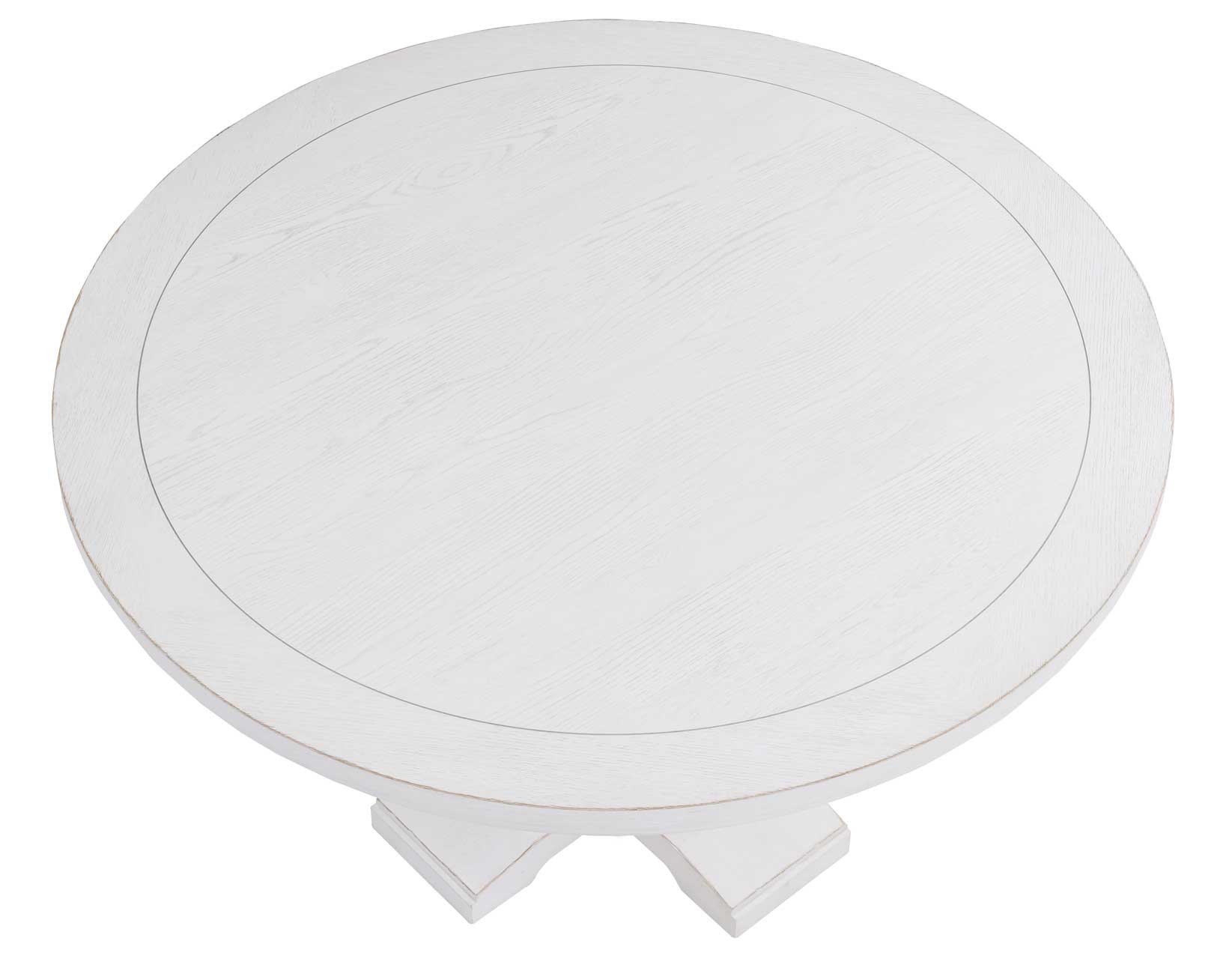 A stately look in a mid-sized round dining table, the Warren 54-inch round table brings French Country inspired designs to your home. This table is finished in an antique white with wood scoring and finish rubthrough on the edges for a slightly shabby appearance that relaxes the piece. Comfortable seating for six, Warren has a regal but relaxed presentation, great for transitional, farmhouse or even modern environments.