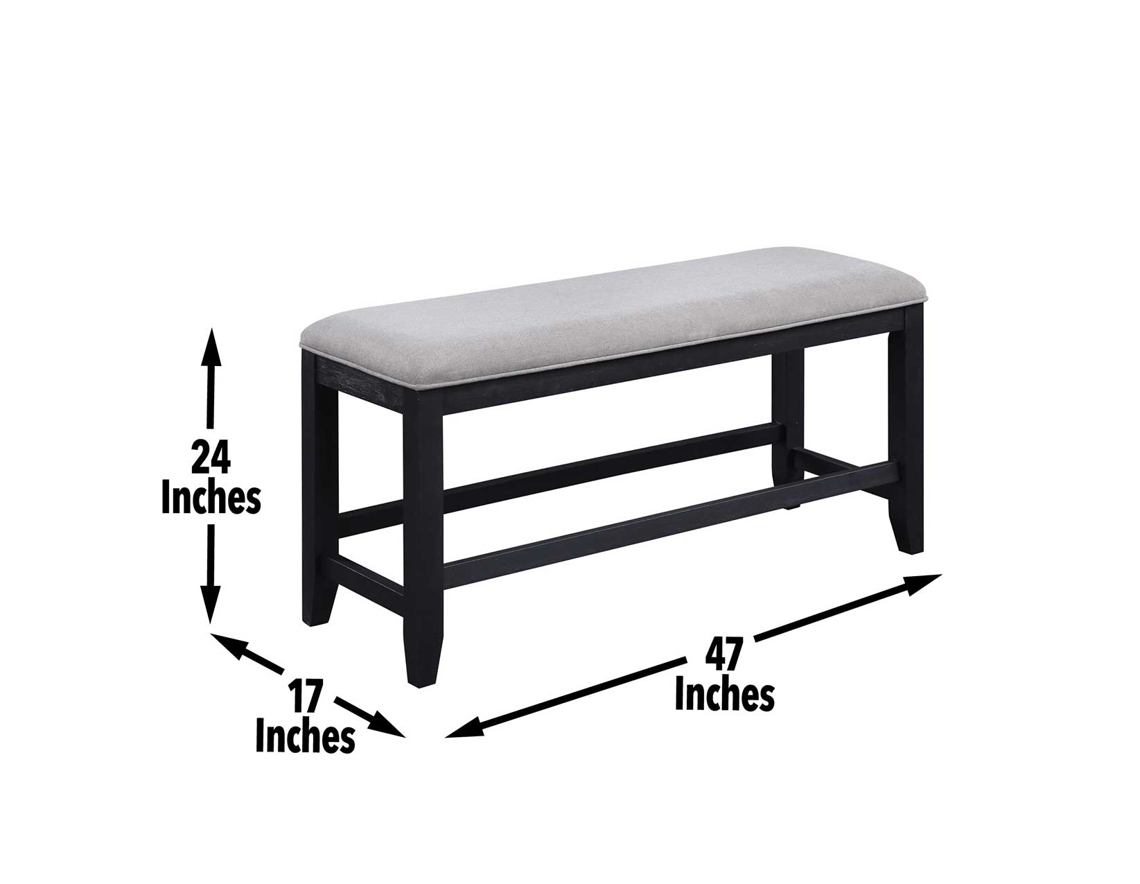 This solid wood Counter Bench adds comfort and style to your modern styled kitchen or dining area. Crafted of Rubberwood solids are finished In a lustrous charcoal finish that blends beautifully with the easy-to-match gray foam-filled fabric seat. This 24-inch high Counter Bench complement either Counter Height dining tables or 36-inch Kitchen Counters and features front and side stretchers to add comfort and strength to the frame. Seat multiple guests or children while adding a touch of modern style with the Yves Counter Bench.