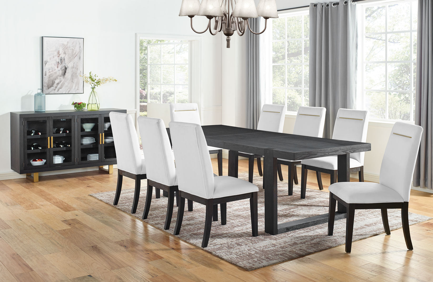 Clean modern living just got a lot easier with the contemporary styling of the Yves collection. A rubbed charcoal finish combines with gold-colored accents on the Parsons Chair and Server to give a look both sleek and warm.